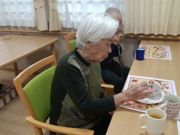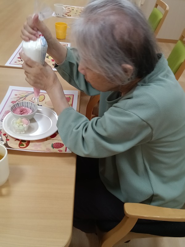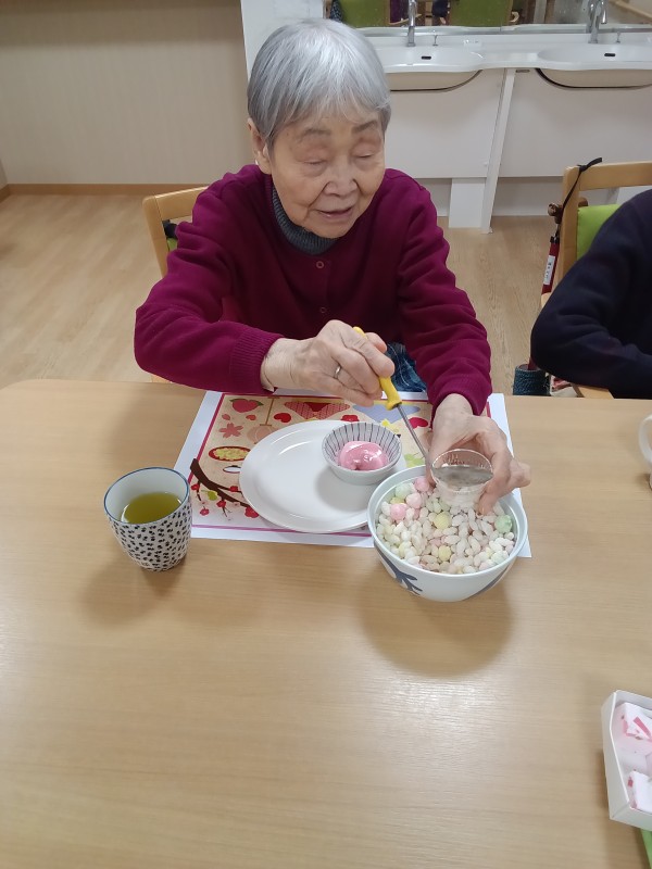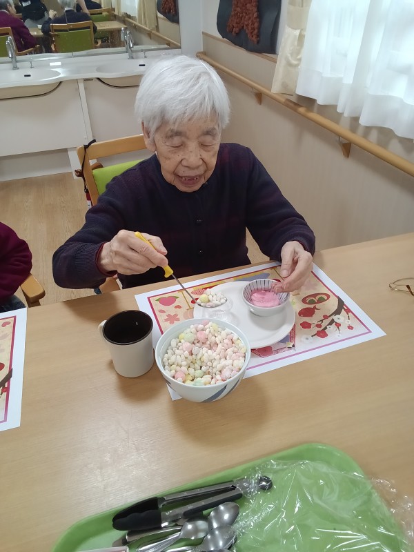 入居者の皆様にはひなあられを掬って器に入れて頂き、生クリームを絞って貰いました!