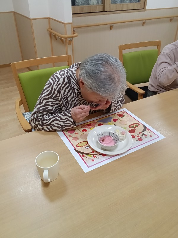 桜のゼリー、砂糖菓子、雛あられに生クリームといったいつもより豪華なおやつに皆様大喜び。