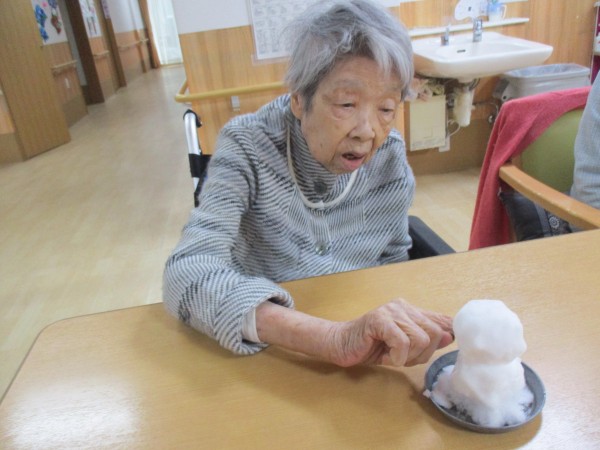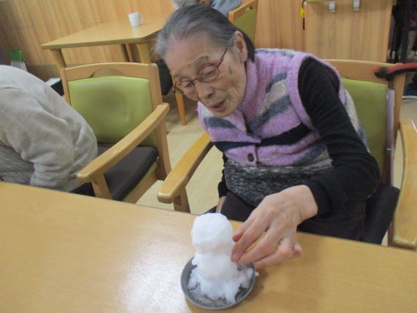 ミニ雪だるまを作り、皆さんの前に持って行くと「あぁ冷たい!!」「綺麗ですね~本物なのかしら?」と触ったり、眺めておりました。