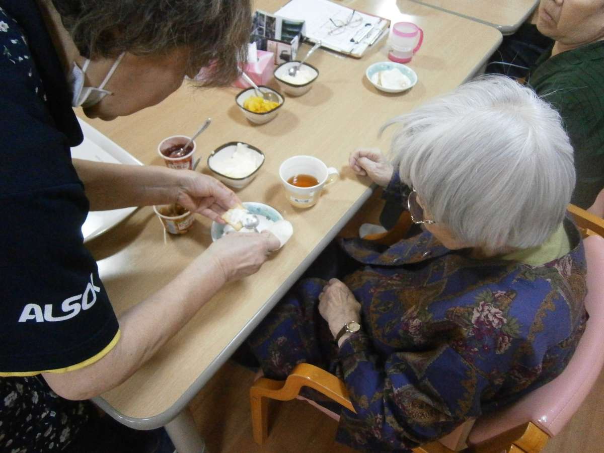チーズクリームの上に苺ジャムをのせ、苺レアチーズケーキ風にしてる入居者様もおられました。