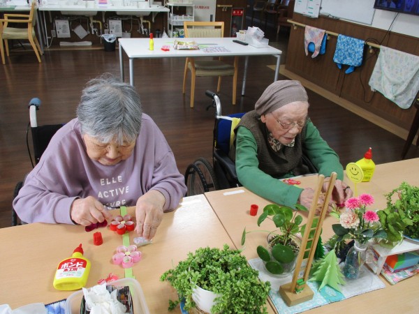 先日、春らしい梅の吊るし飾りを制作するレクリエーションを行いました(^^♪