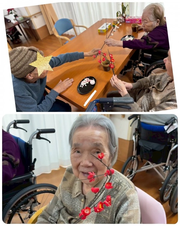 雛飾りの桃の花も、みんなで愛でる。『よくできてるね〜!本物かと思ったよ』『紅白だね、きれいだね』