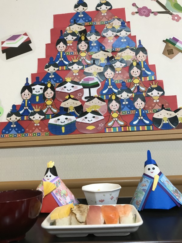雛飾りはスタッフが頑張って作った作品です(*^^*)