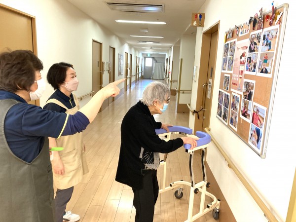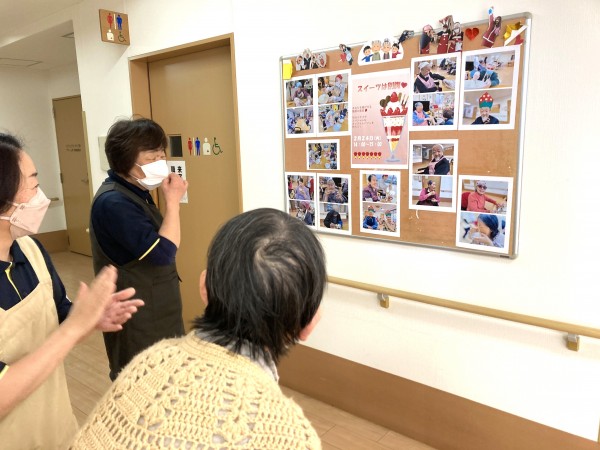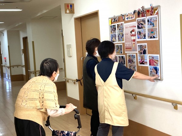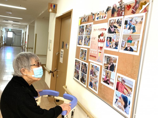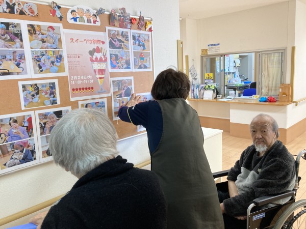 2月の料理レク「イチゴパフェ」の写真を廊下に貼った様子を、ブログ担当のママがご紹介いたします♡