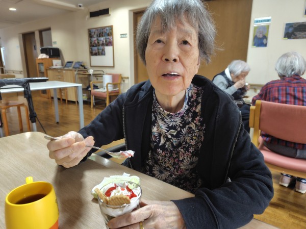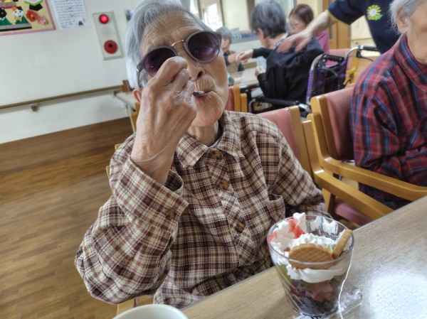 職員がパフェを皆様の前で調理し、皆様早く食べたそうに眺めて