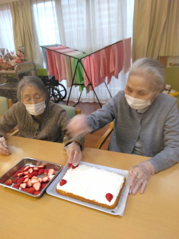 ひなまつりパーティーの前に、いちごショートケーキのデコレーションを行いました(о´∀`о)