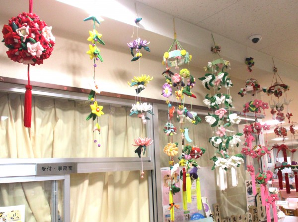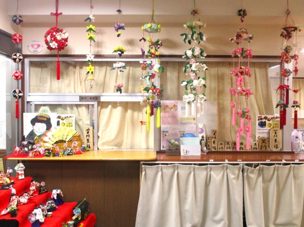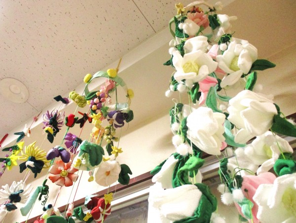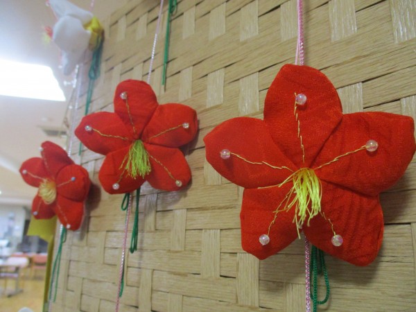 ご利用者様がひと針ひと針コツコツと丁寧に心を込めて作ってくださった作品が、ひなまつりの季節らしく玄関を華やかに彩ってくれています。