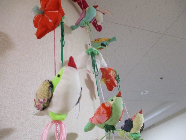 この吊るし雛は、玄関に飾られている雛飾りと同じく、ご利用者様がさまざまな布を使って作ってくださった作品です。手先がとても器用で、これまでも季節の作品作りで素敵な作品を見せてくださっています。色とりどりの飾りが連なる吊るし雛には、季節を感じるさまざまな飾りがついており、見ているだけでも心が明るくなります。ひとつひとつ丁寧に作られていて、手作りならではの温もりを感じる素敵な作品です。玄関に入るとまず目に入る華やかな飾りに、「とってもきれい」「すばらしいね」と足を止めて眺めてくださる方も多くいらっしゃいました。