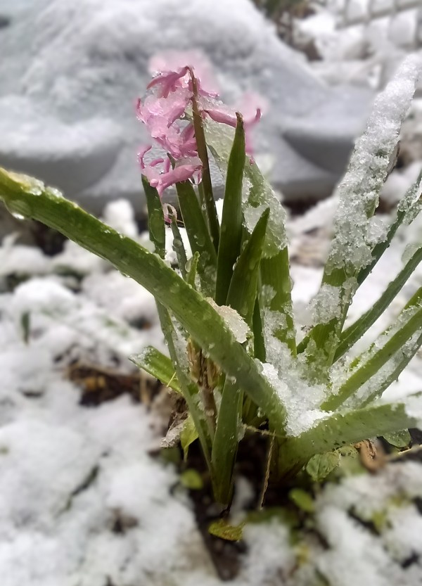庭に咲いたヒヤシンスも寒そうに凍えています