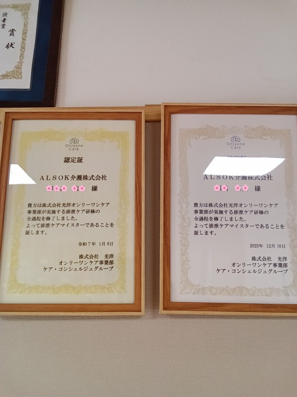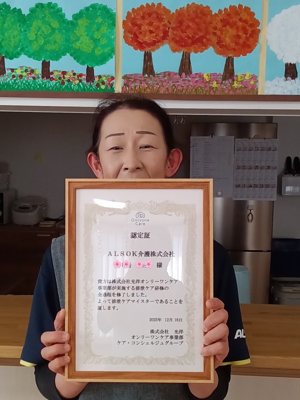 排泄ケアマスター取得しました〜٩(๑`^´๑)۶研修ではおむつの正しい知識と当て方、スキンケア技能を学びスタッフへの指導など、リーダーとして活躍してくれます。又「排泄ケアのプロ」として認められ、利用者様の快適性向上に貢献しています\(^o^)/