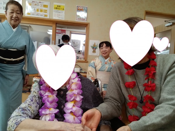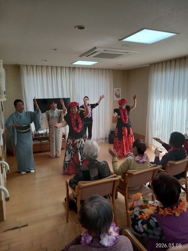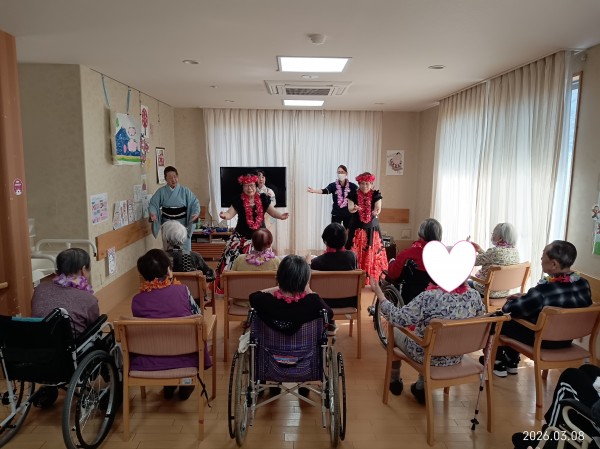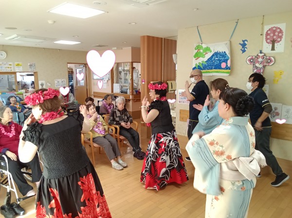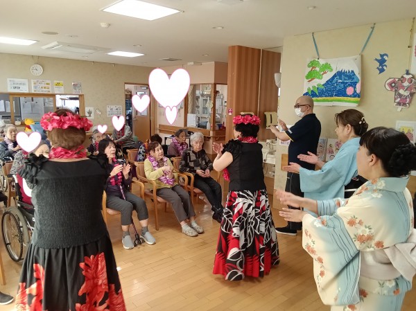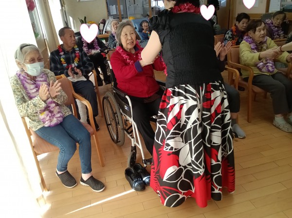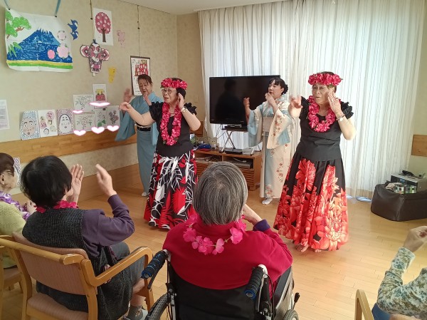 フラダンスではゆったりとした音楽に合わせてご利用者様も口ずさまれながら一緒に手や体を動かして楽しまれるご様子がありました。