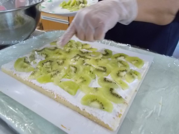 先ずキーウイをカットしてスポンジケーキの下段に並べます。