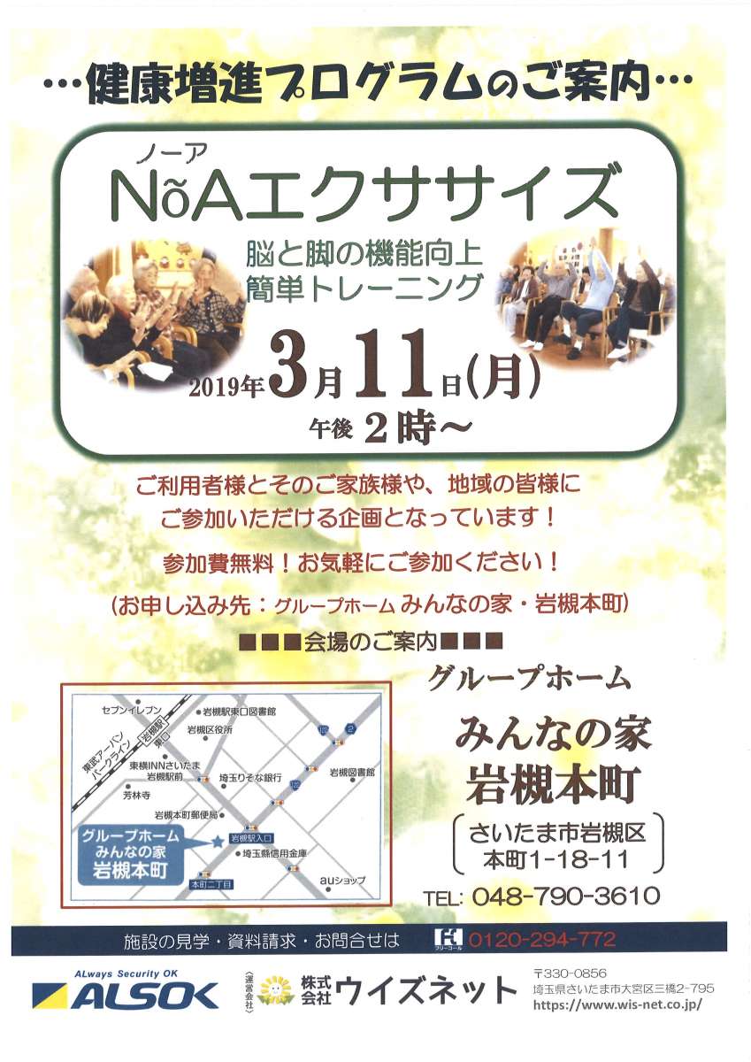 ◎グループホーム みんなの家・南中野で 3月11日 14:00~14:30に ”ノーア エクササイズ教室”を開催致します。どなたでもご自由に参加できます。お気軽にお越しください。