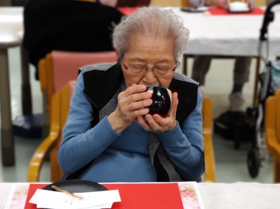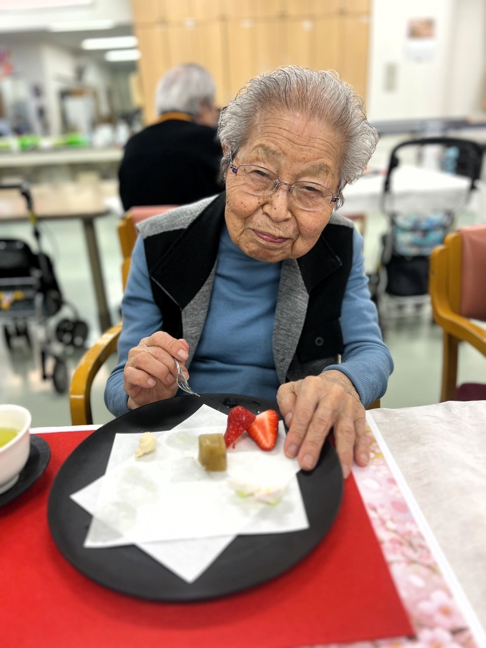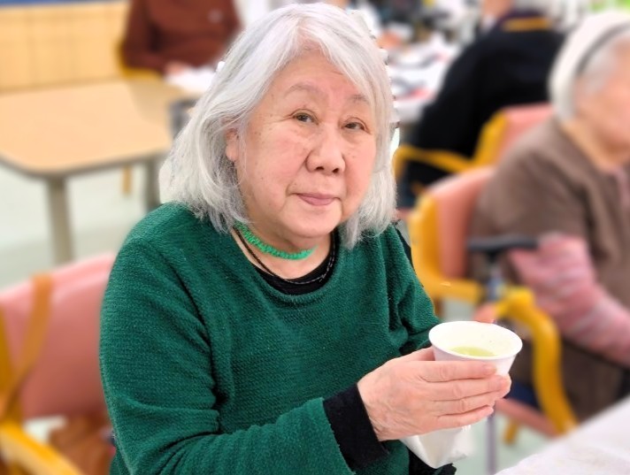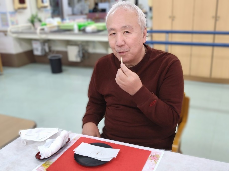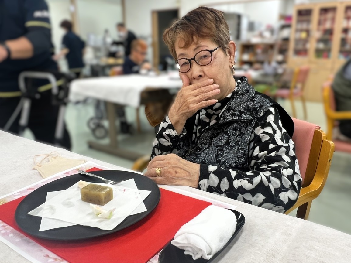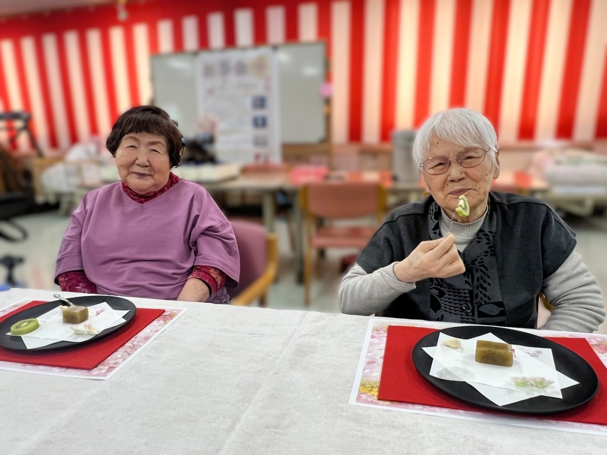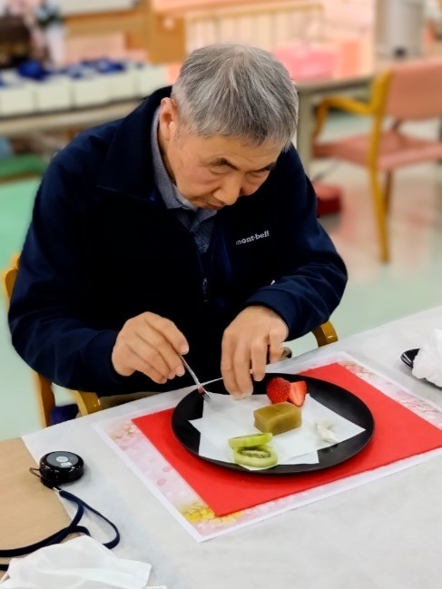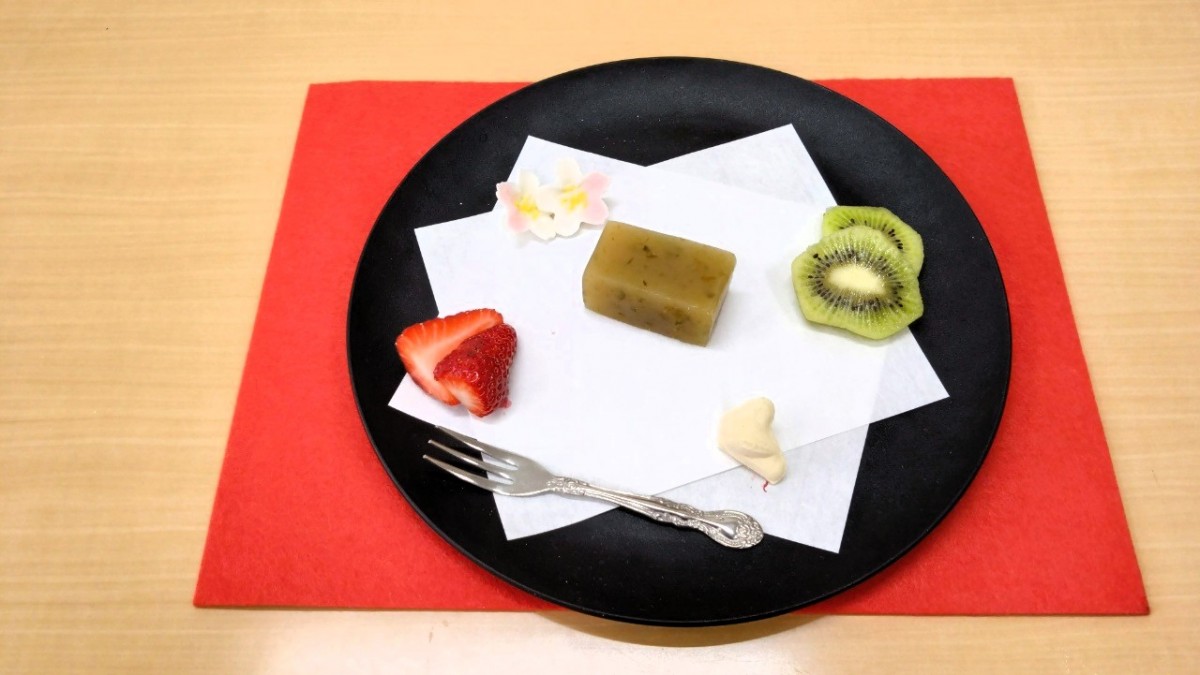 ふきのとうのほろ苦さと上品な甘さ、桜の千菓子の華やかさが春らしさを演出し、利用者様「季節を感じられて嬉しいですね。」と笑顔で召し上がっておられました。また、フルーツの爽やかな味わいも加わり、見た目にも楽しんでいただけるひとときとなりました。