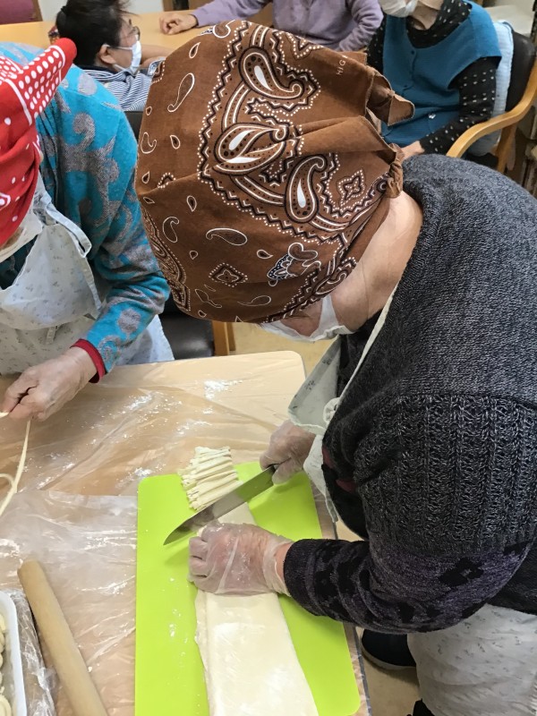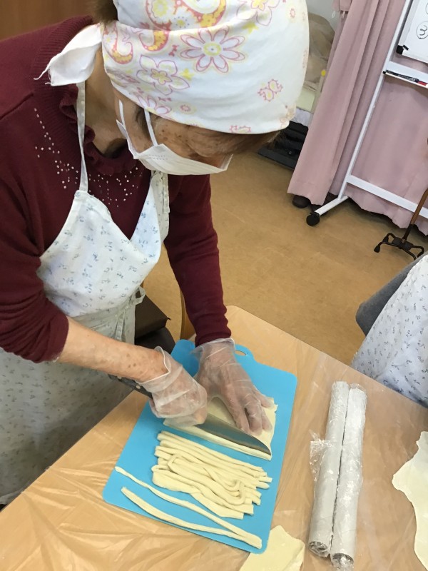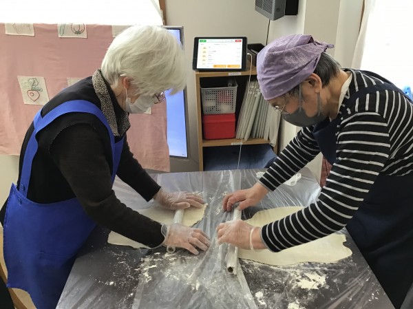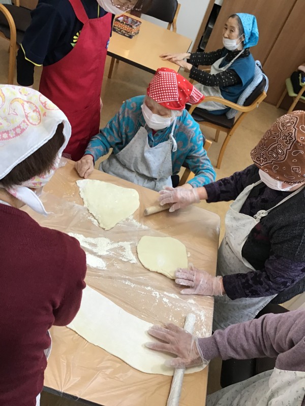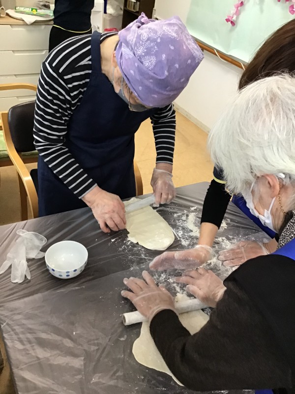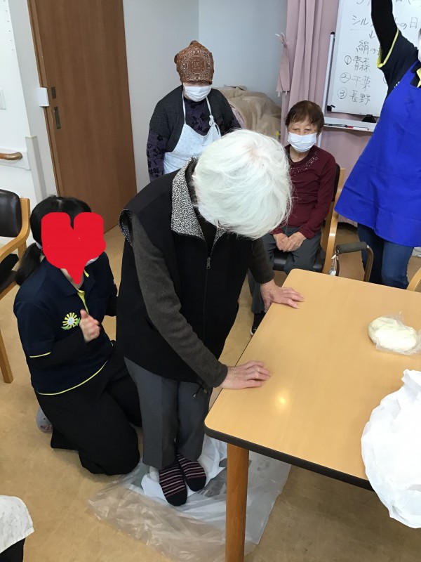 生地を捏ねるために利用者様皆様に生地を踏んでいただきました!