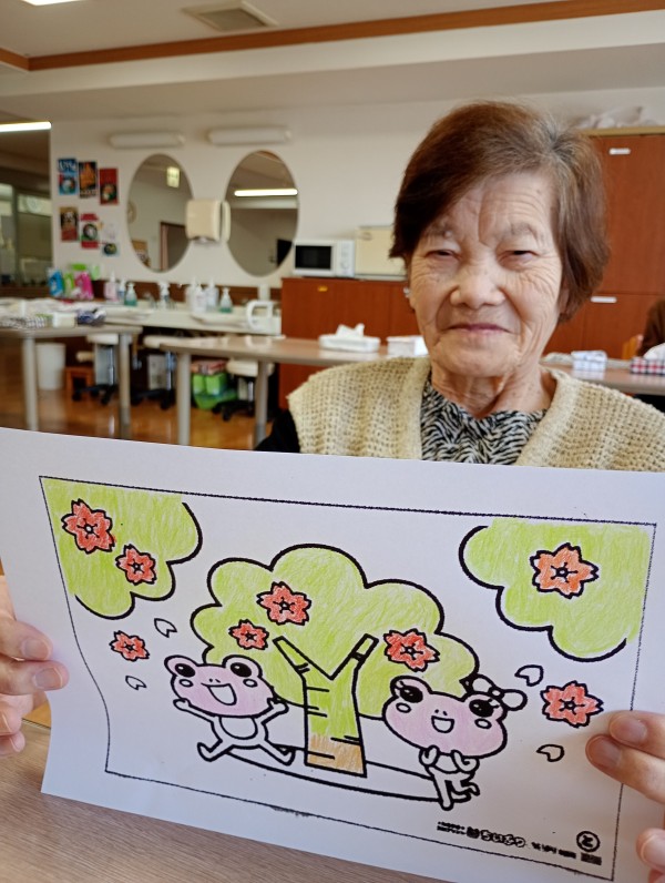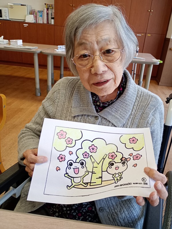 三人の方はぬり絵をしました。桜の木とカエル…それぞれ皆さん味があり綺麗にぬっておられました。