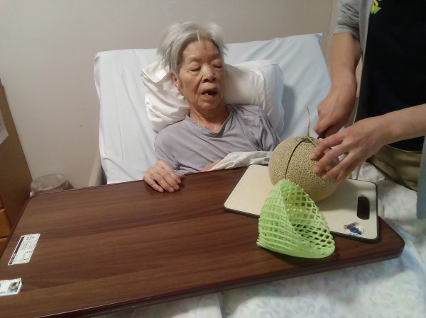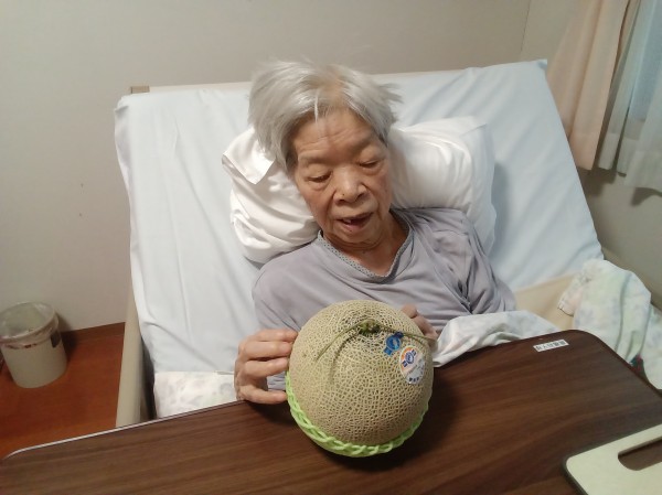 ホーム長が利用者様の目の前にメロンをドーンと置いて見せると目に輝きが!