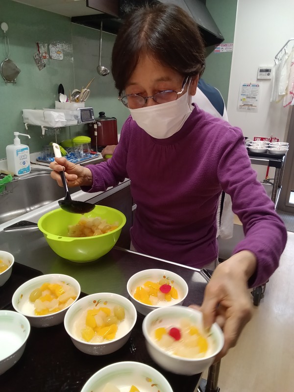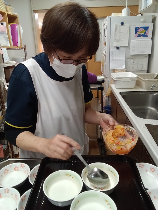 お昼ご飯準備の一コマです!フルーツの盛り付けをお手伝いして下さったお母様!