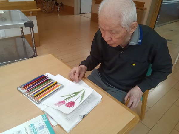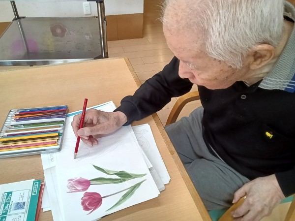 見本のチューリップの絵をお手本ににお父様は赤い色鉛筆でチューリップを描かれました(´ω`)
