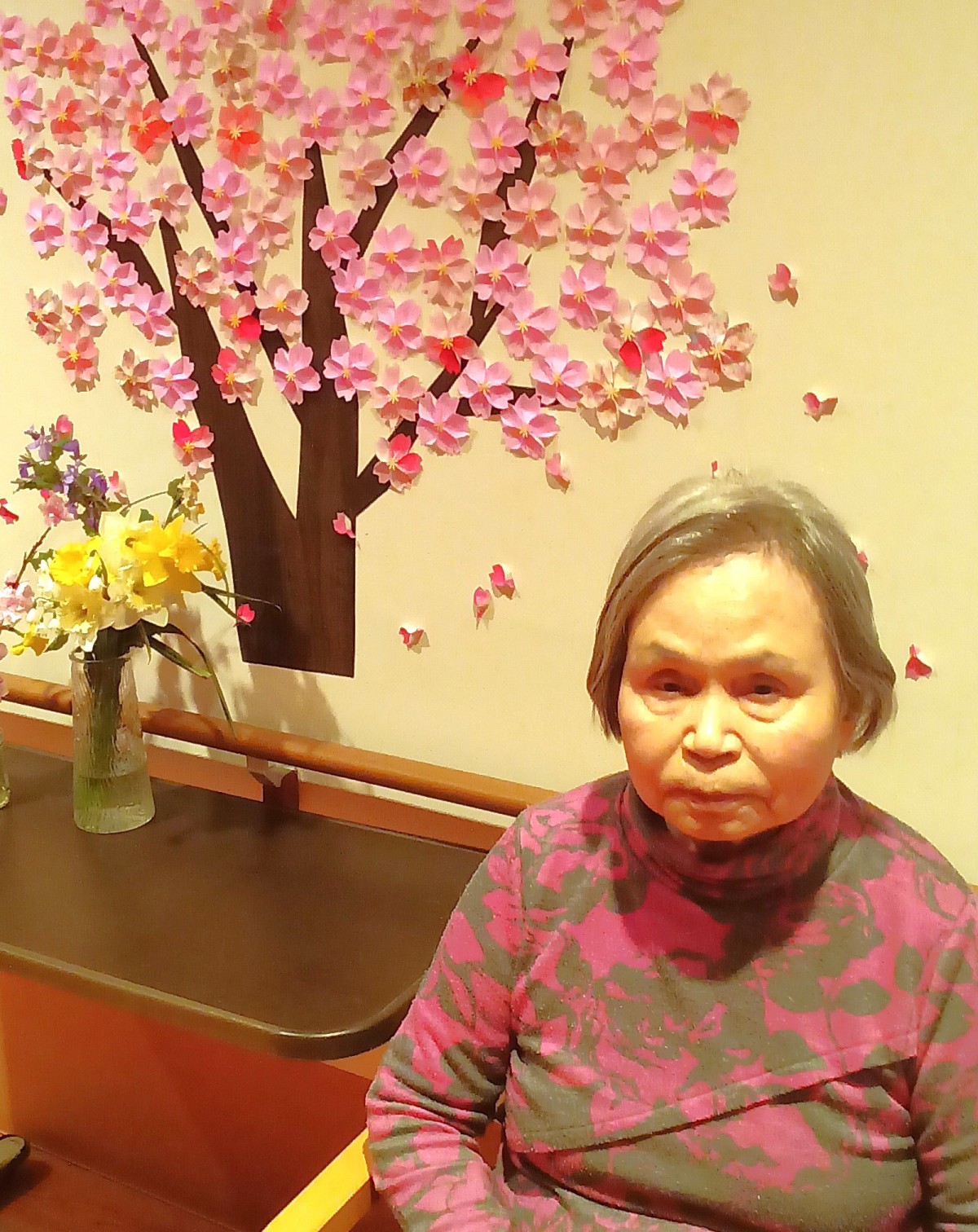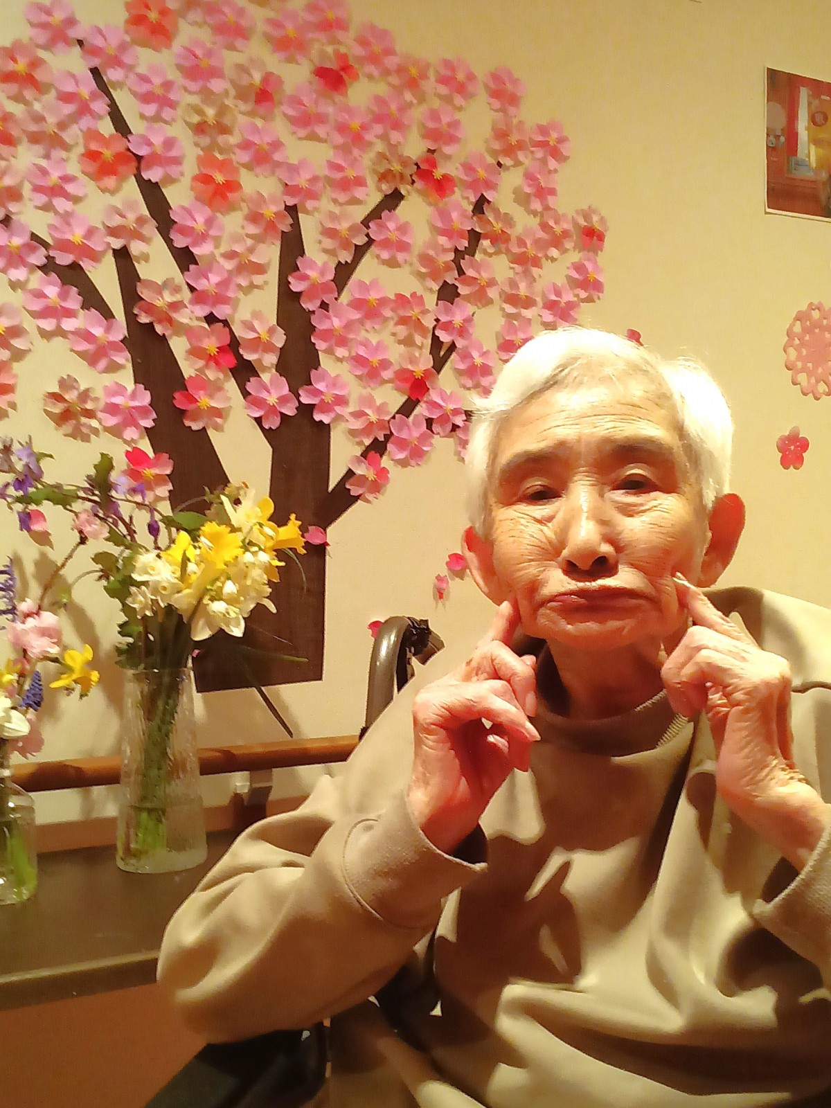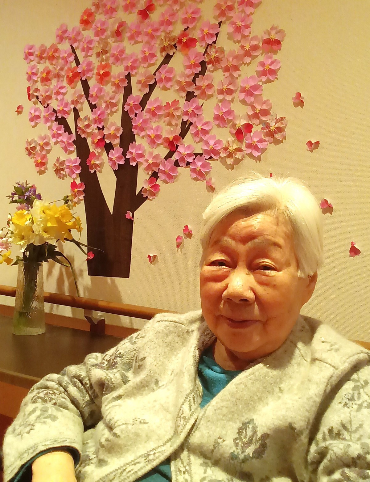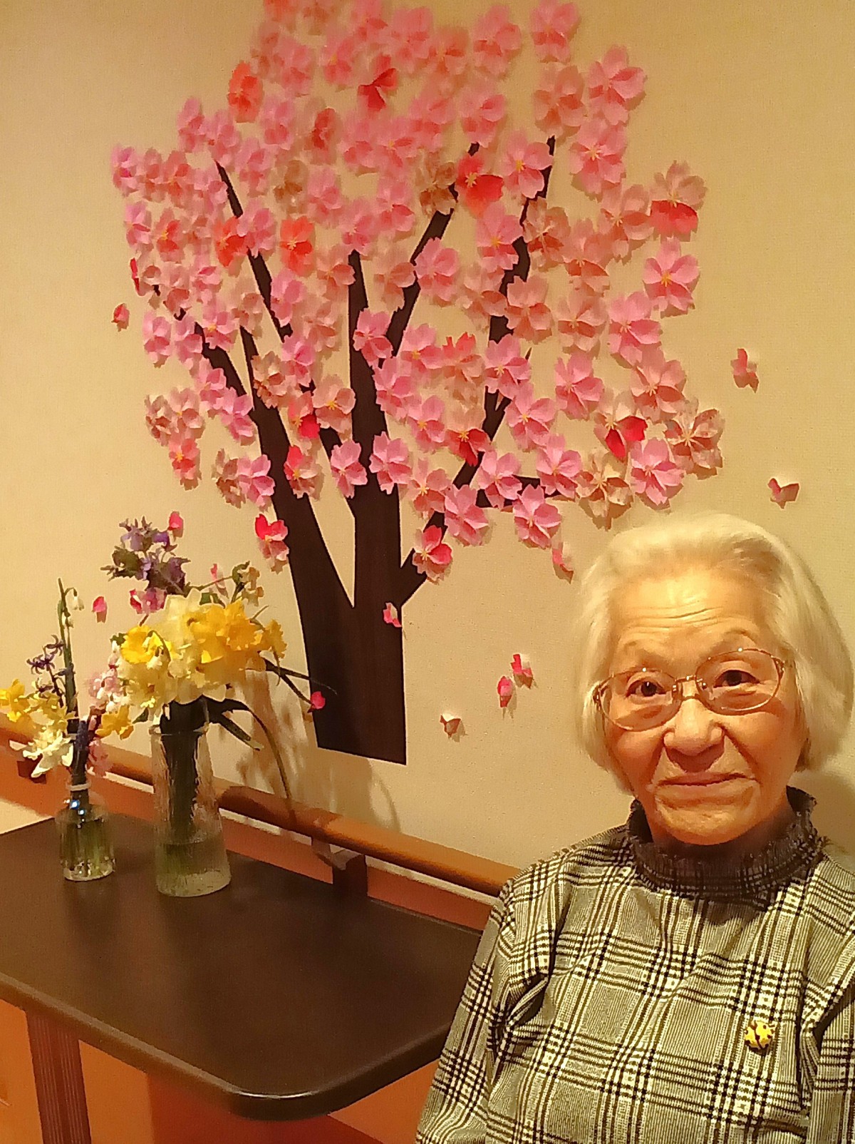 ケアスタッフお手製の折り紙で作った桜の樹を背景に記念撮影♪(*´∀`)
