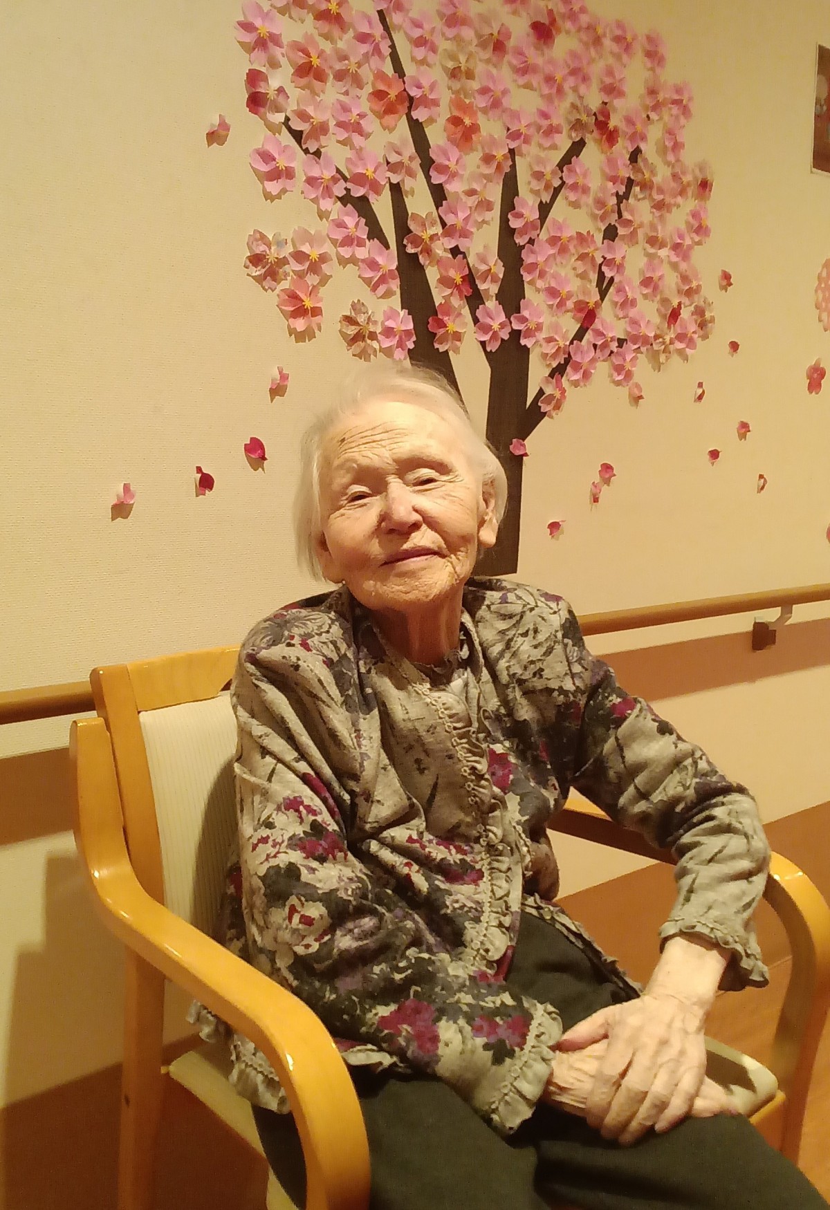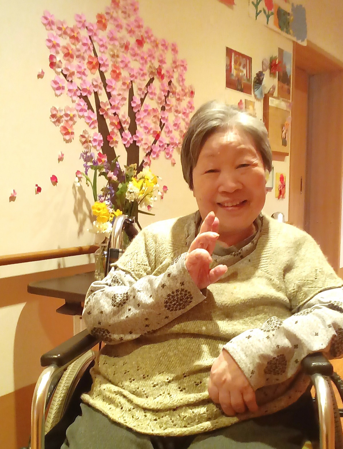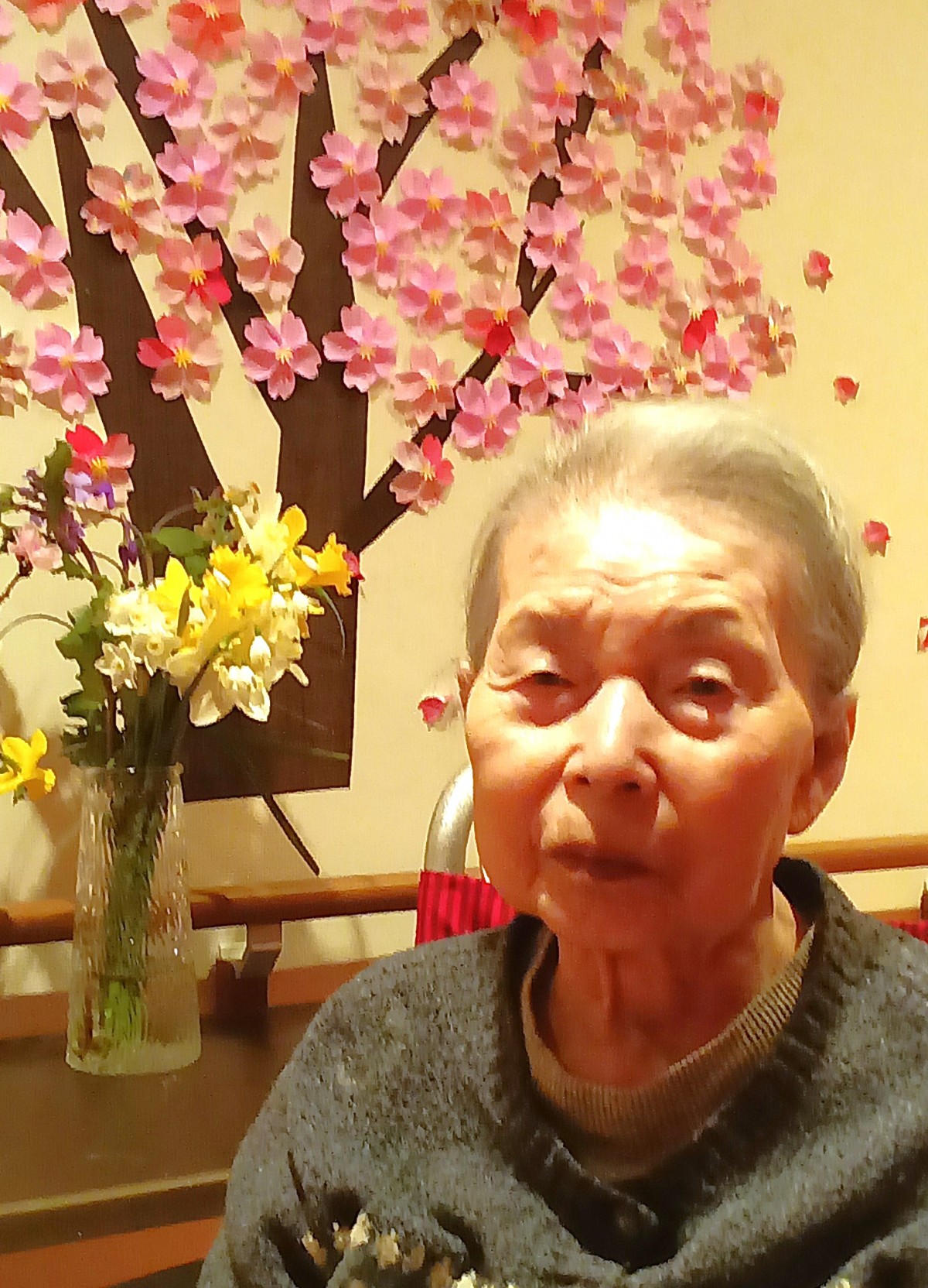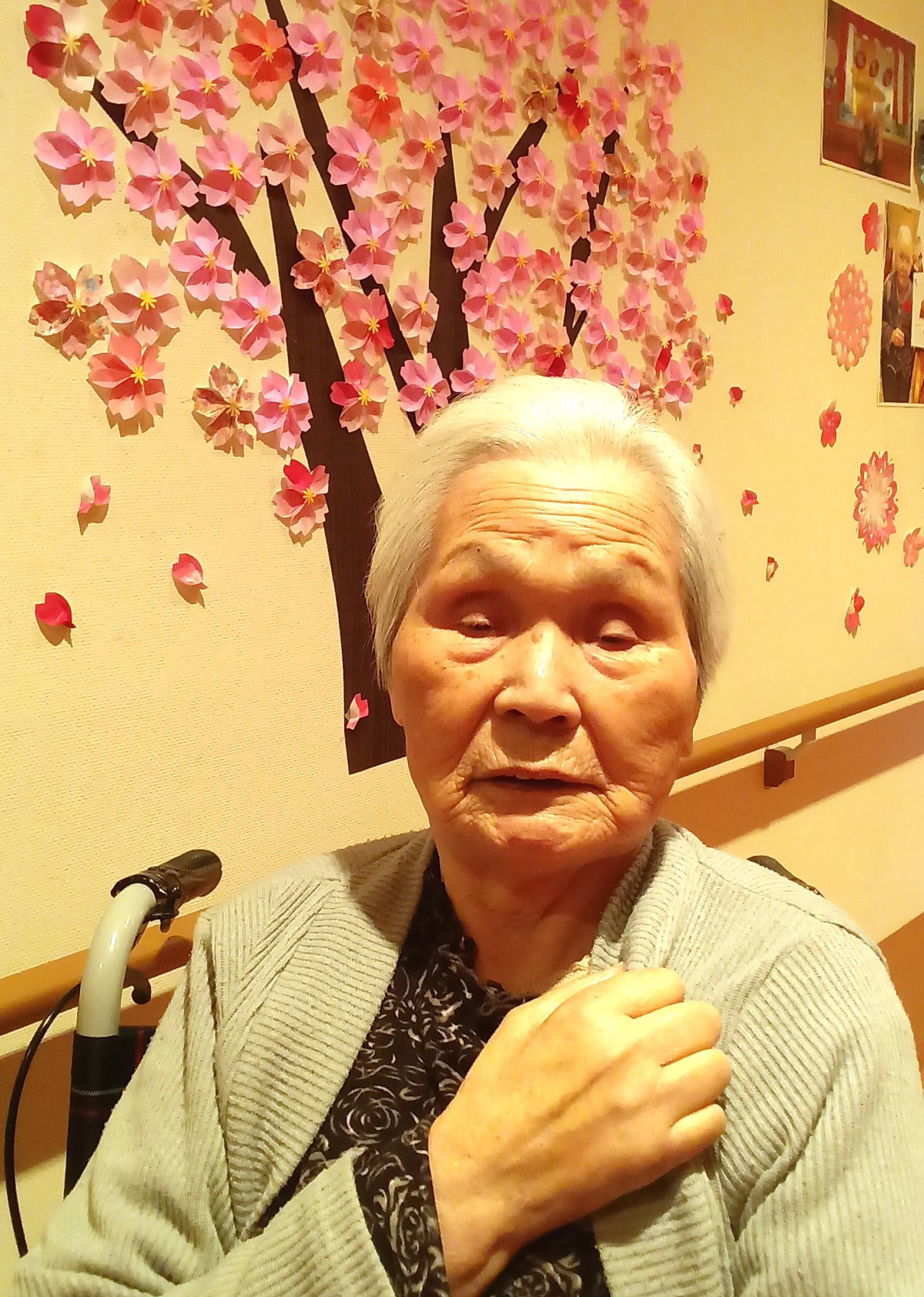 ケアスタッフお手製の折り紙で作った桜の樹を背景に記念撮影♪(*´∀`)