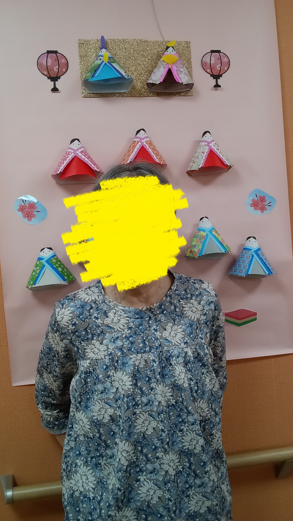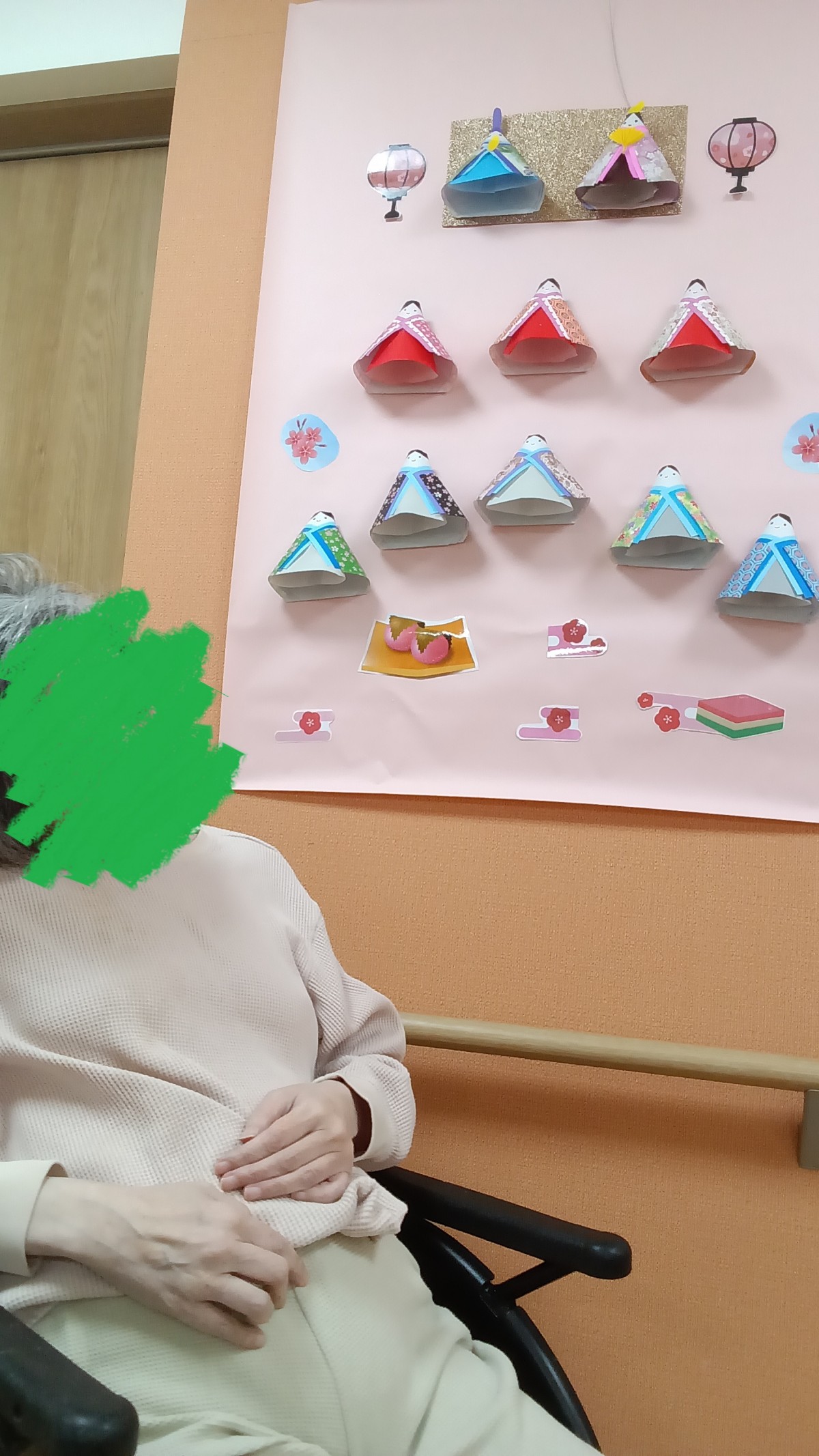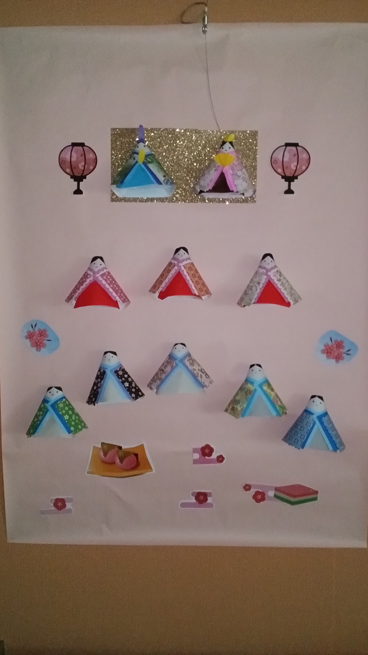 少しでもひな祭りの気分を楽しめるように壁飾りをひな人形風に変えました!