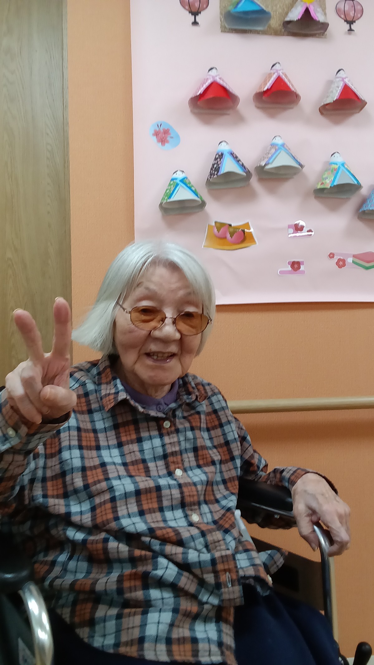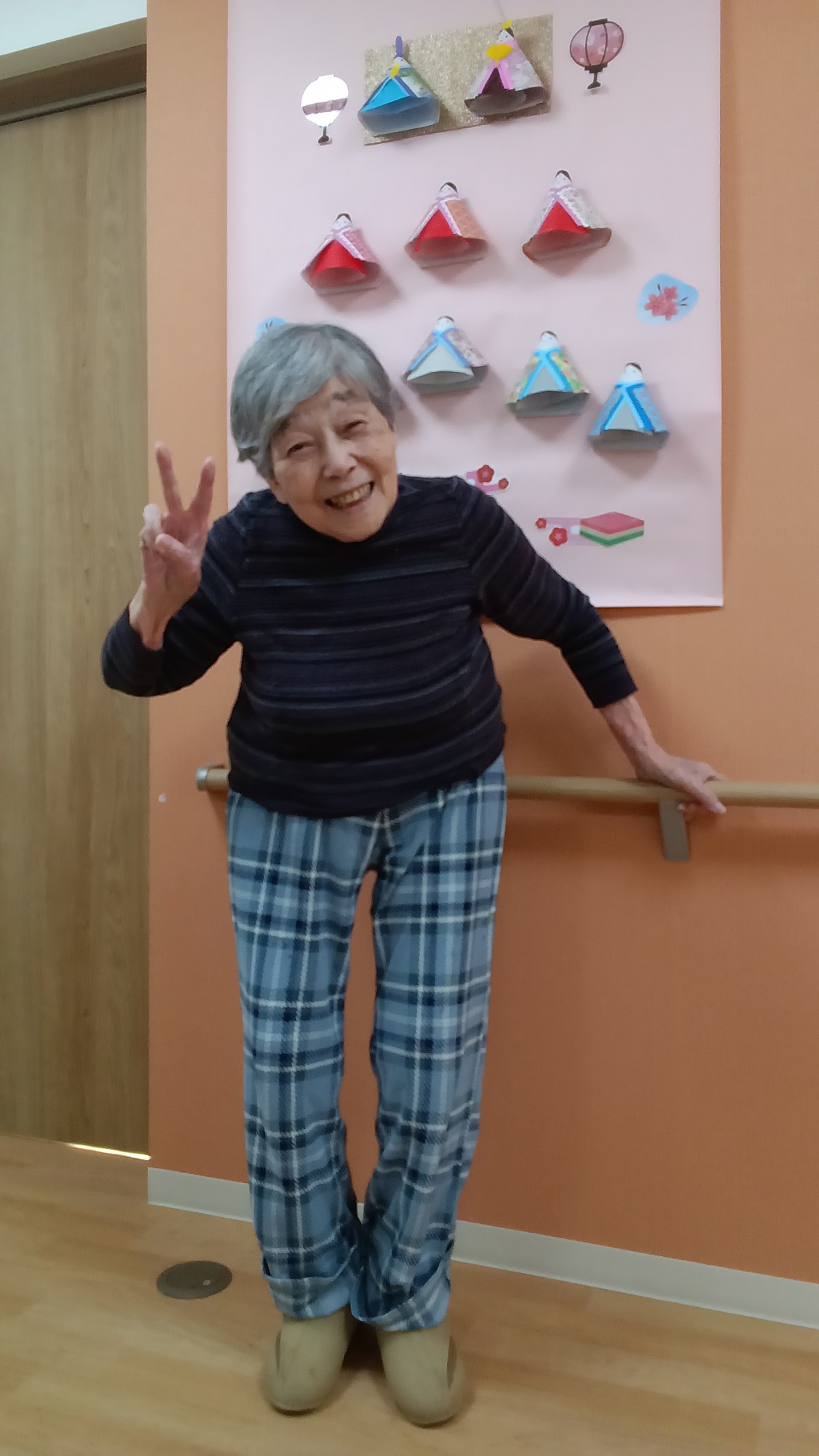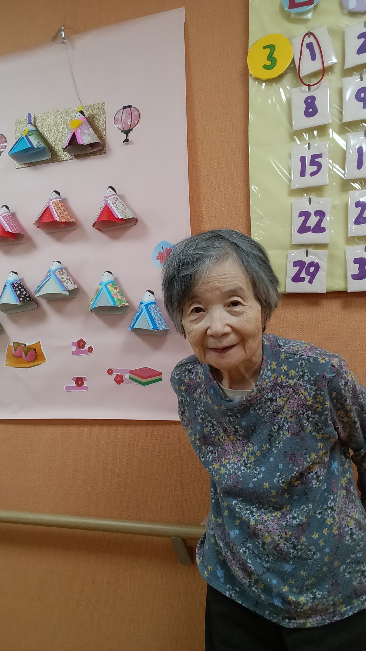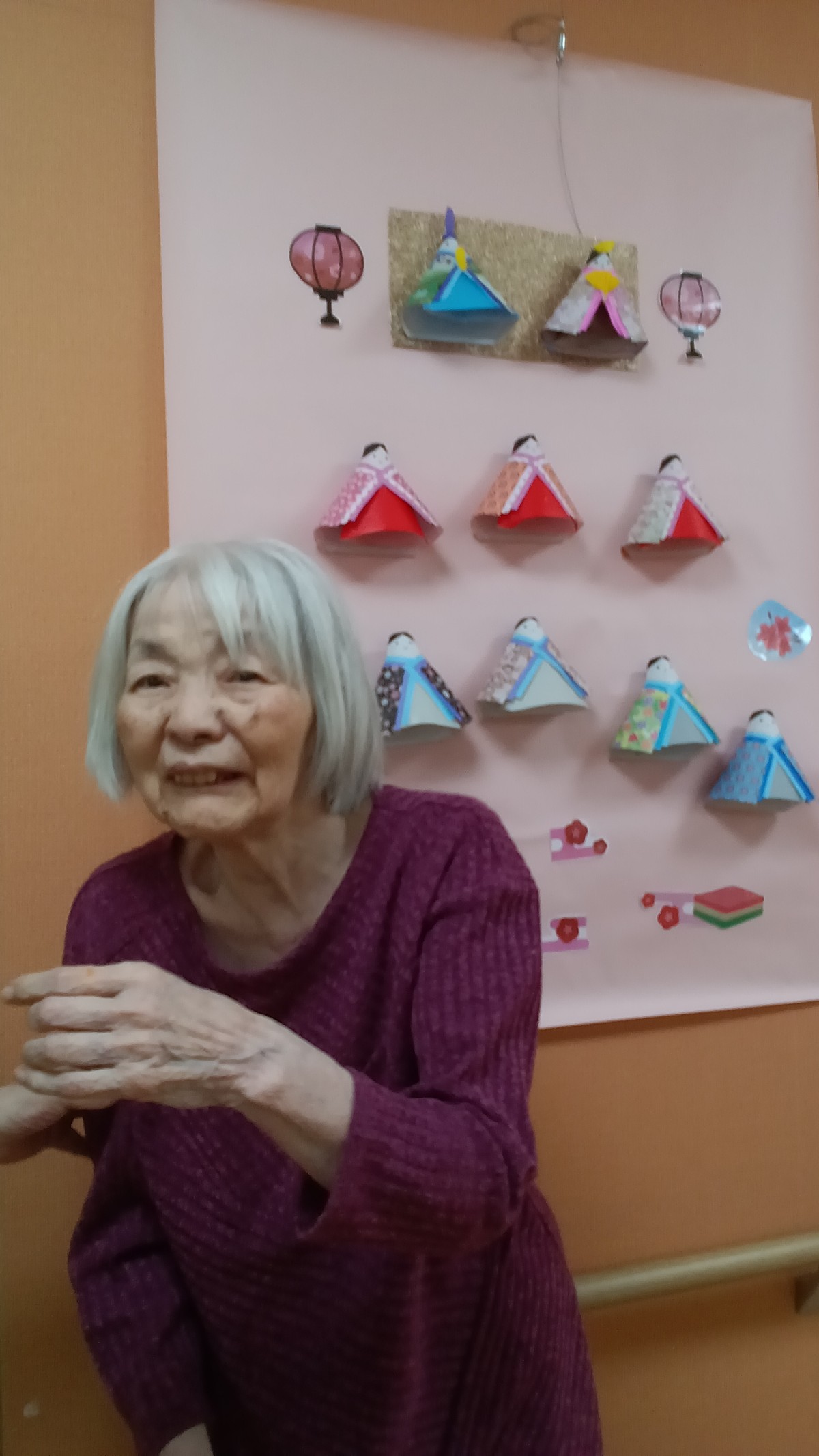 少しでもひな祭りの気分を楽しめるように壁飾りをひな人形風に変えました!