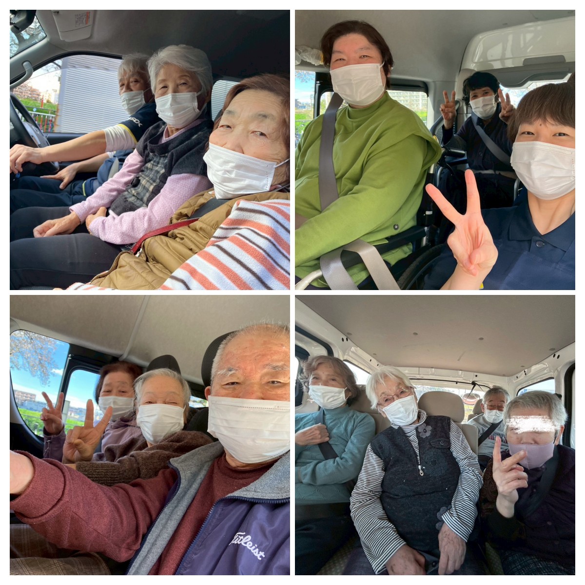 普段は、ご自宅から同乗した方々の家を回るコースしか知らない方が多いですが、お天気の中満開に咲いた桜を眺めては車内で大歓声‼️