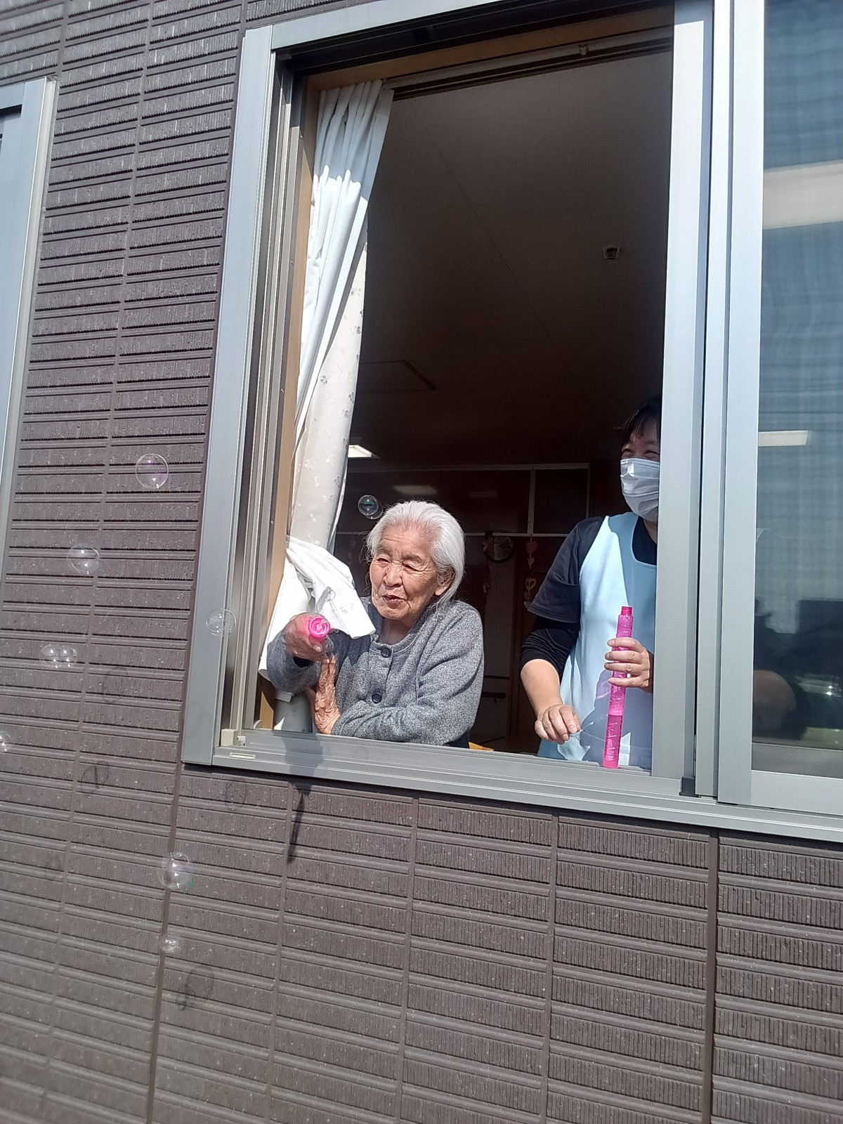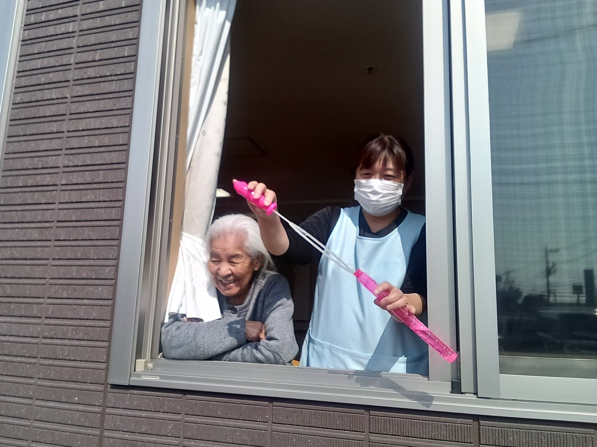 散歩に行かれている利用者様をホームの駐車場で発見!!窓越しでシャボン玉を飛ばして見ました(^^♪