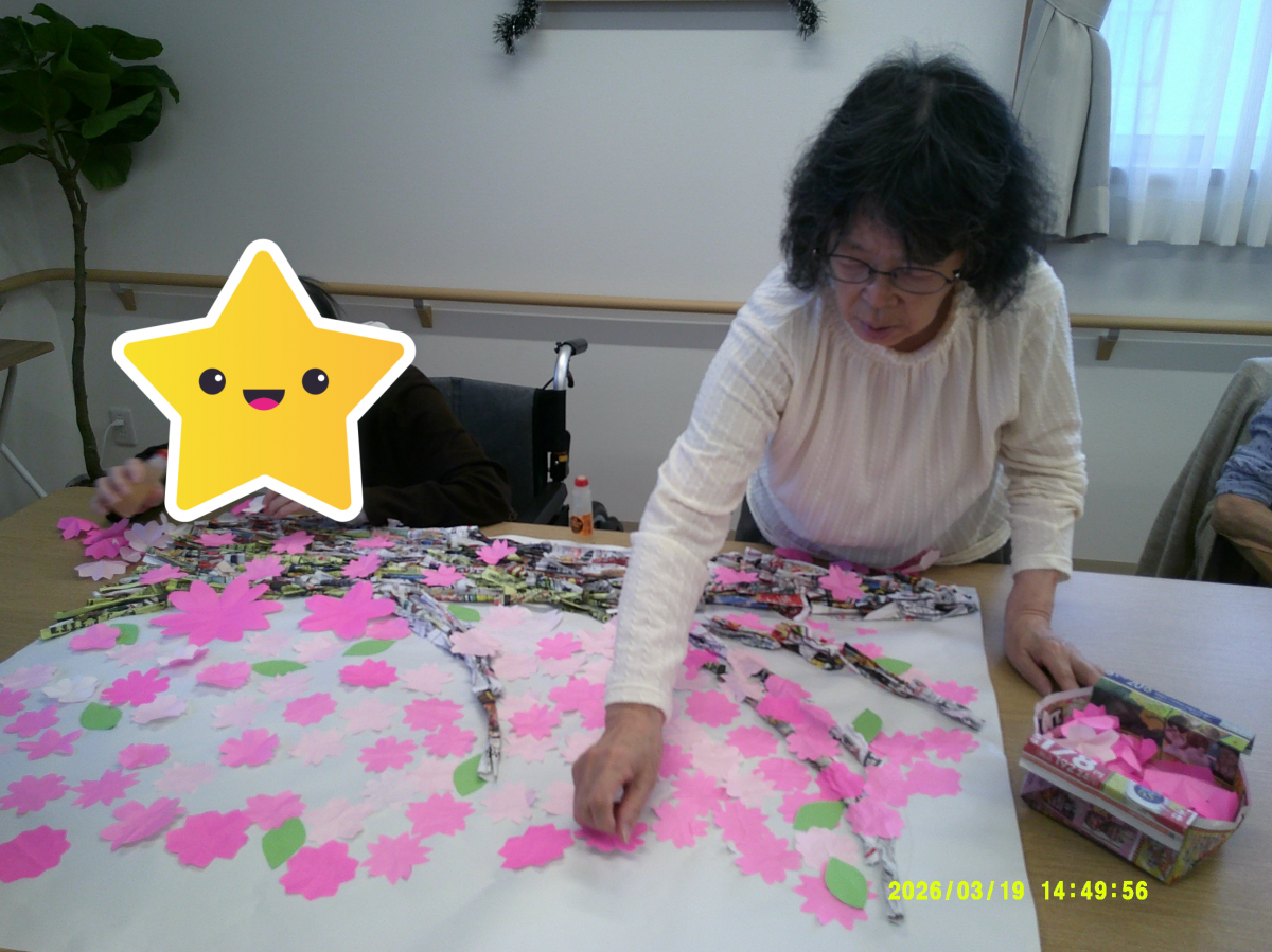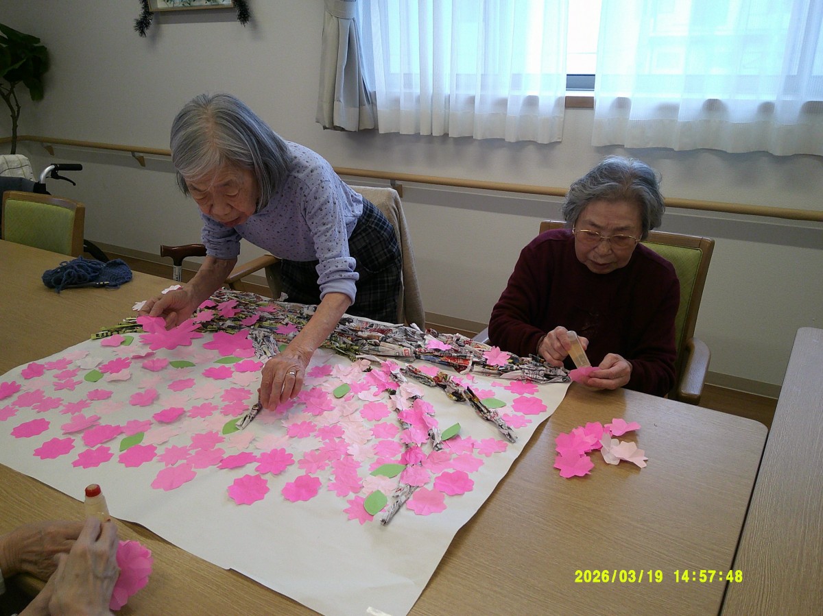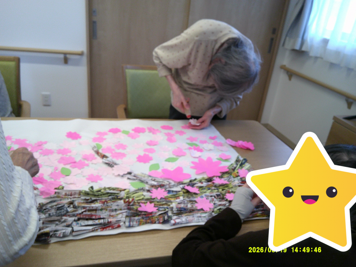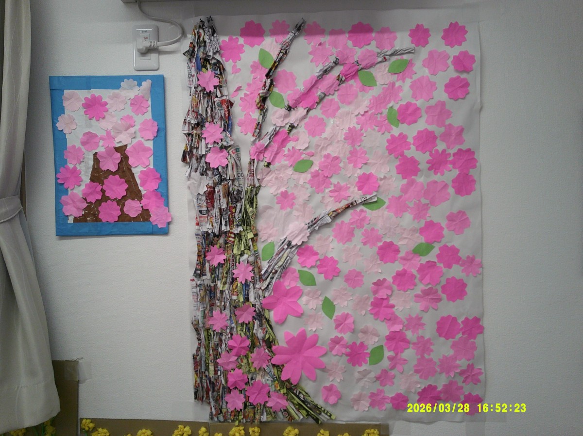 チラシで作った枝に桜を貼っていきます!