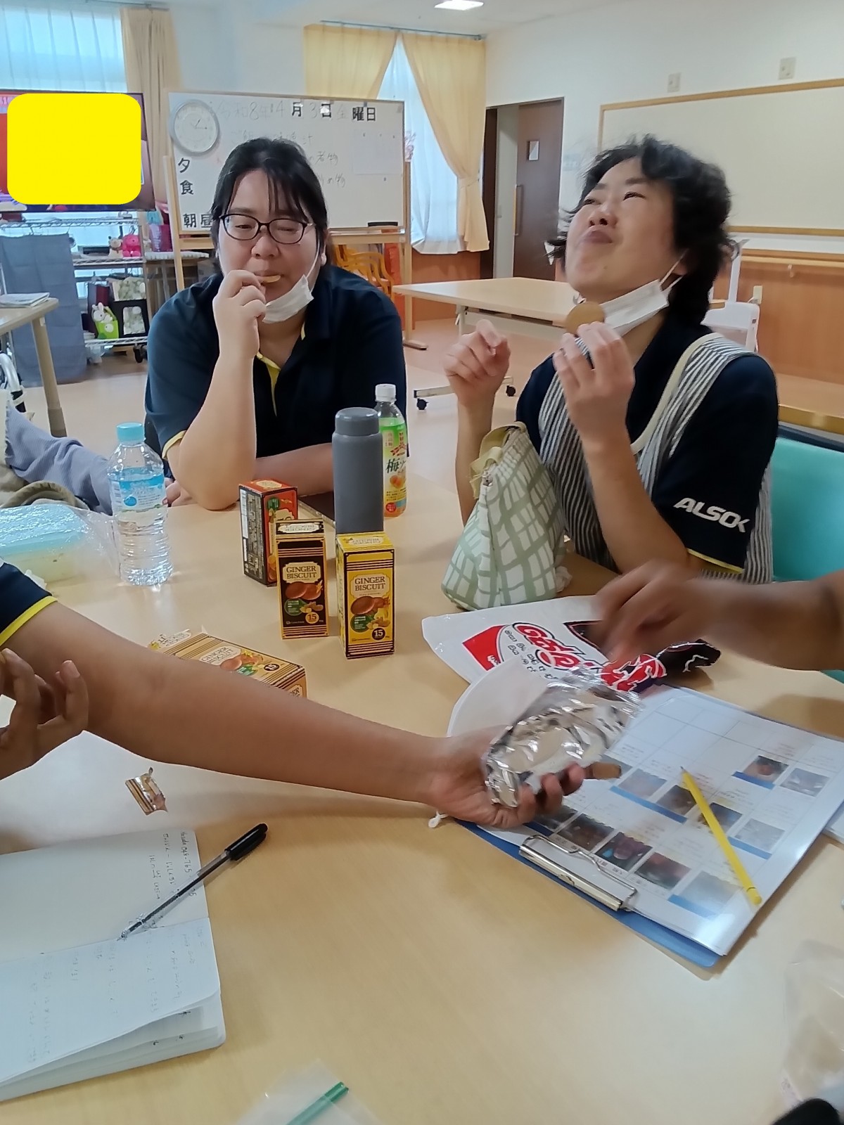 お昼の休憩時間には、日本人スタッフと一緒に食事をされながら、ご利用者様個々の特徴や介護方法などを聞いてはメモを取る姿がありました。