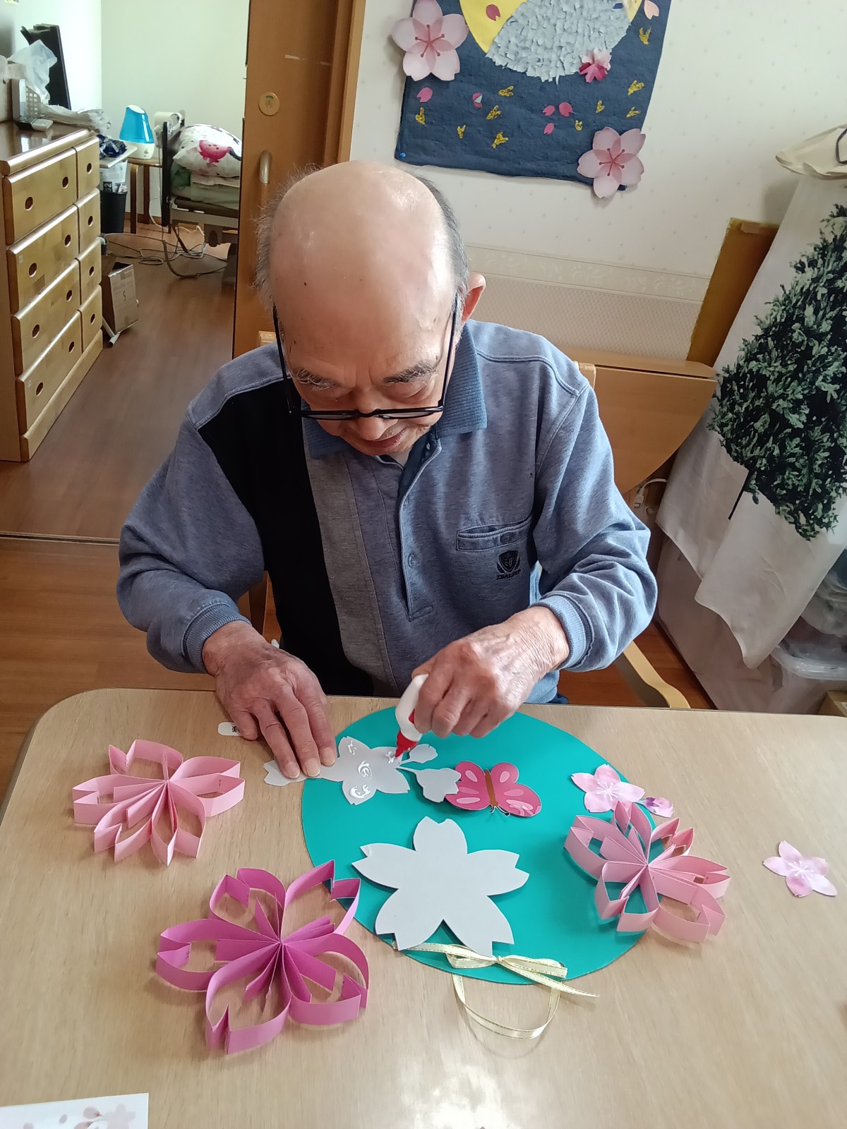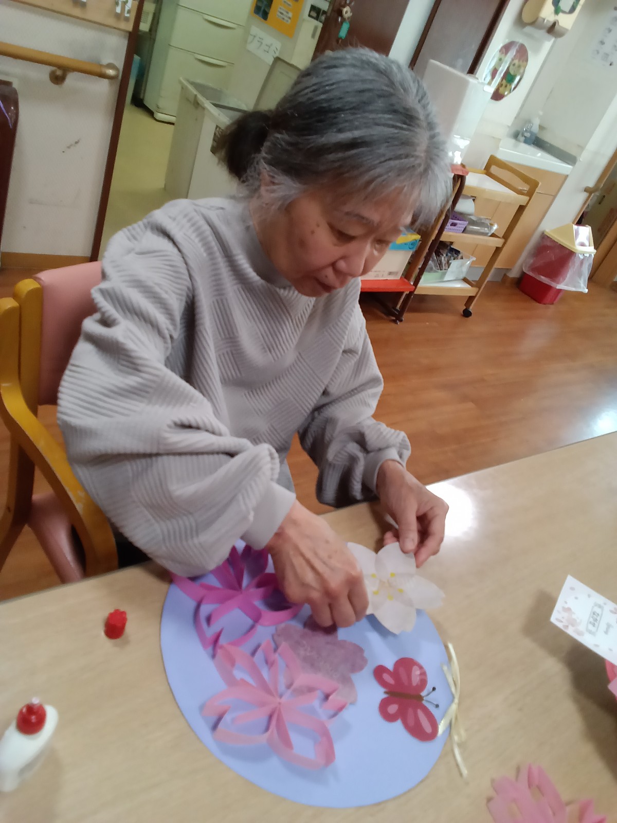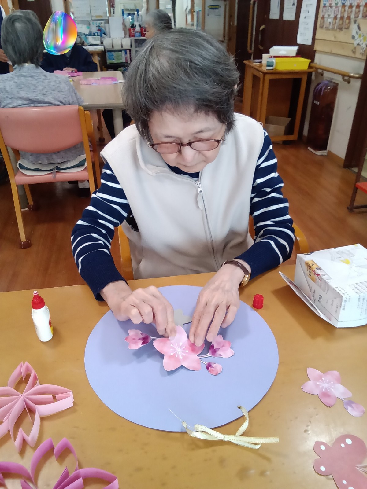 桜が満開なりそれに因んで桜の飾りを作りました。皆さん真剣な表情で色や並びを工夫し、ステキな飾りになりました。