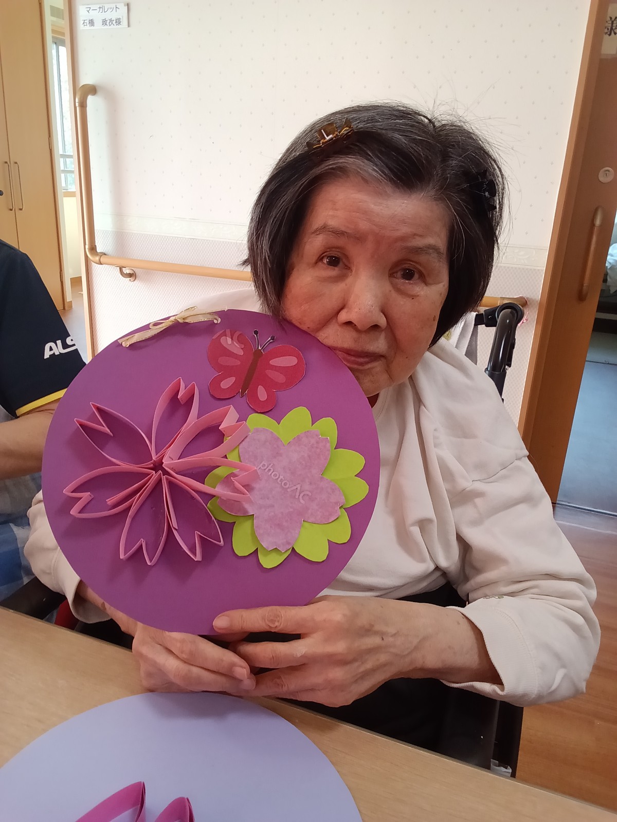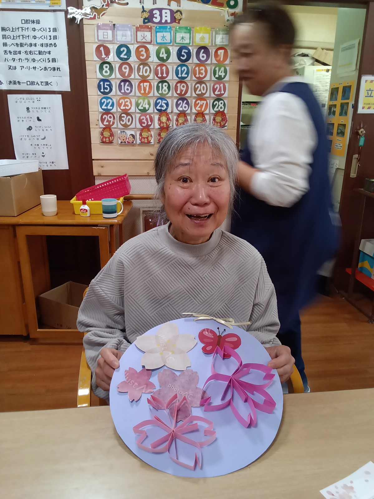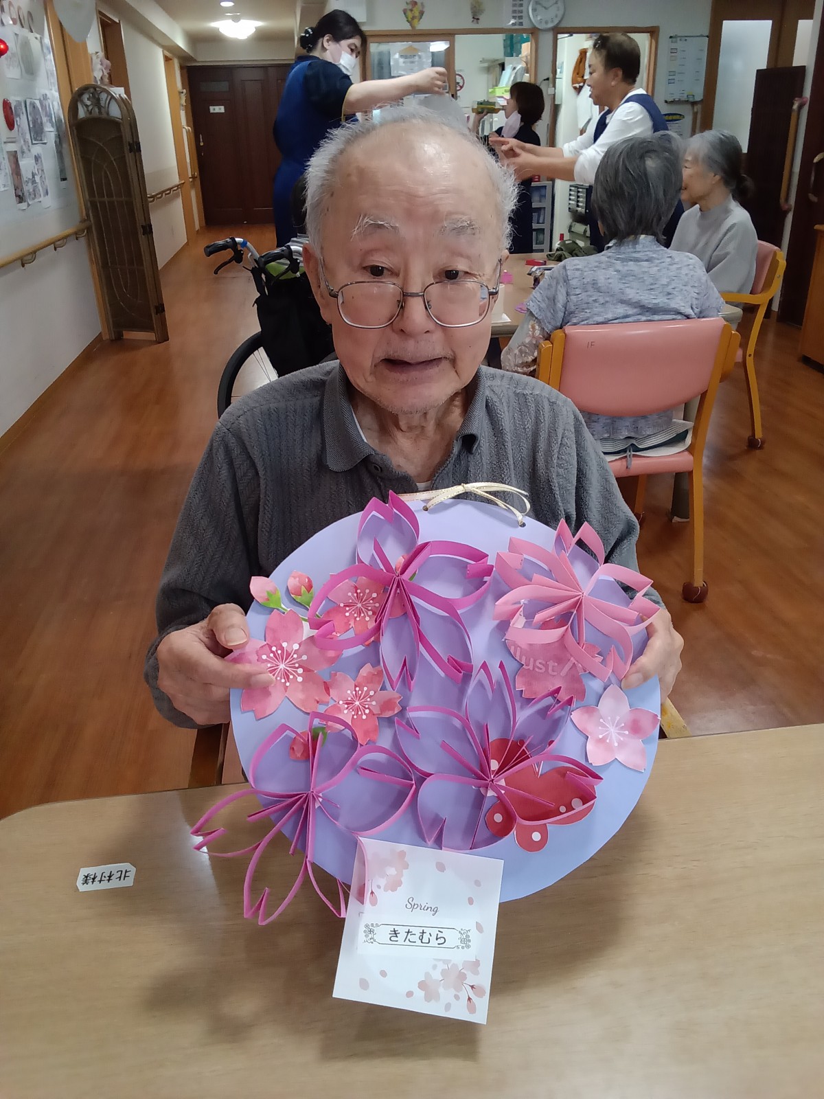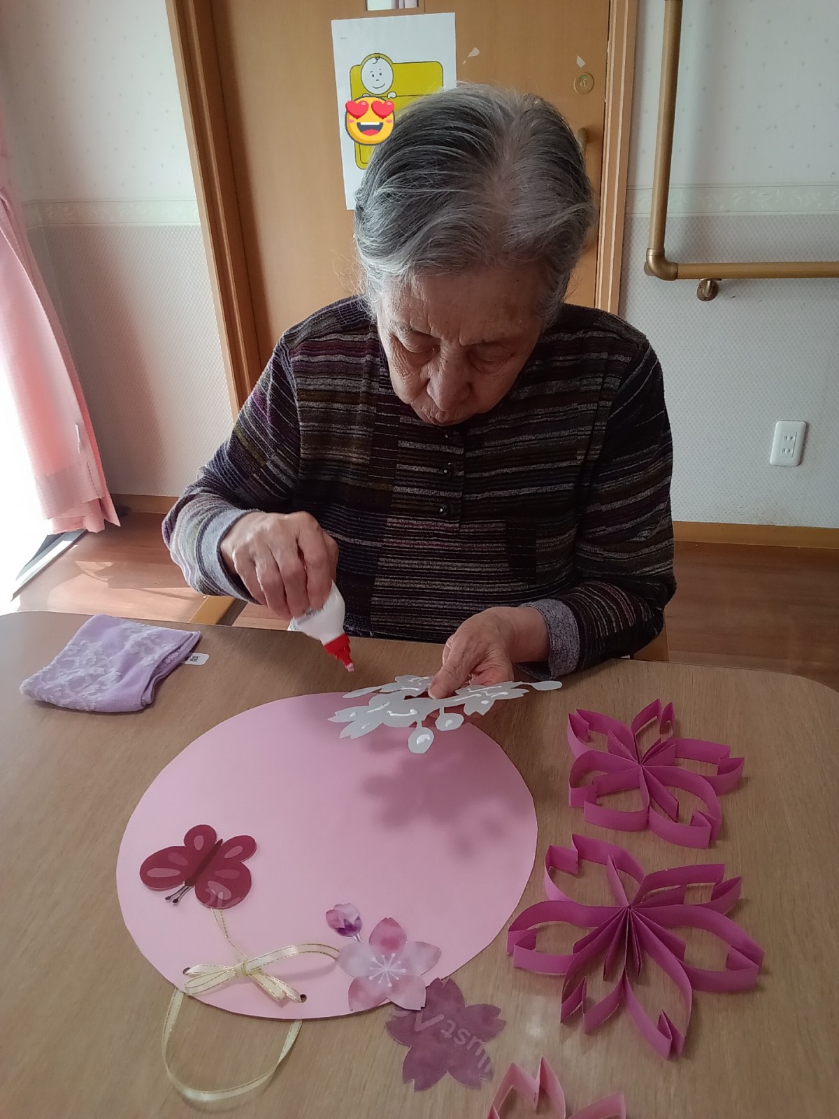 桜が満開なりそれに因んで桜の飾りを作りました。皆さん真剣な表情で色や並びを工夫し、ステキな飾りになりました。