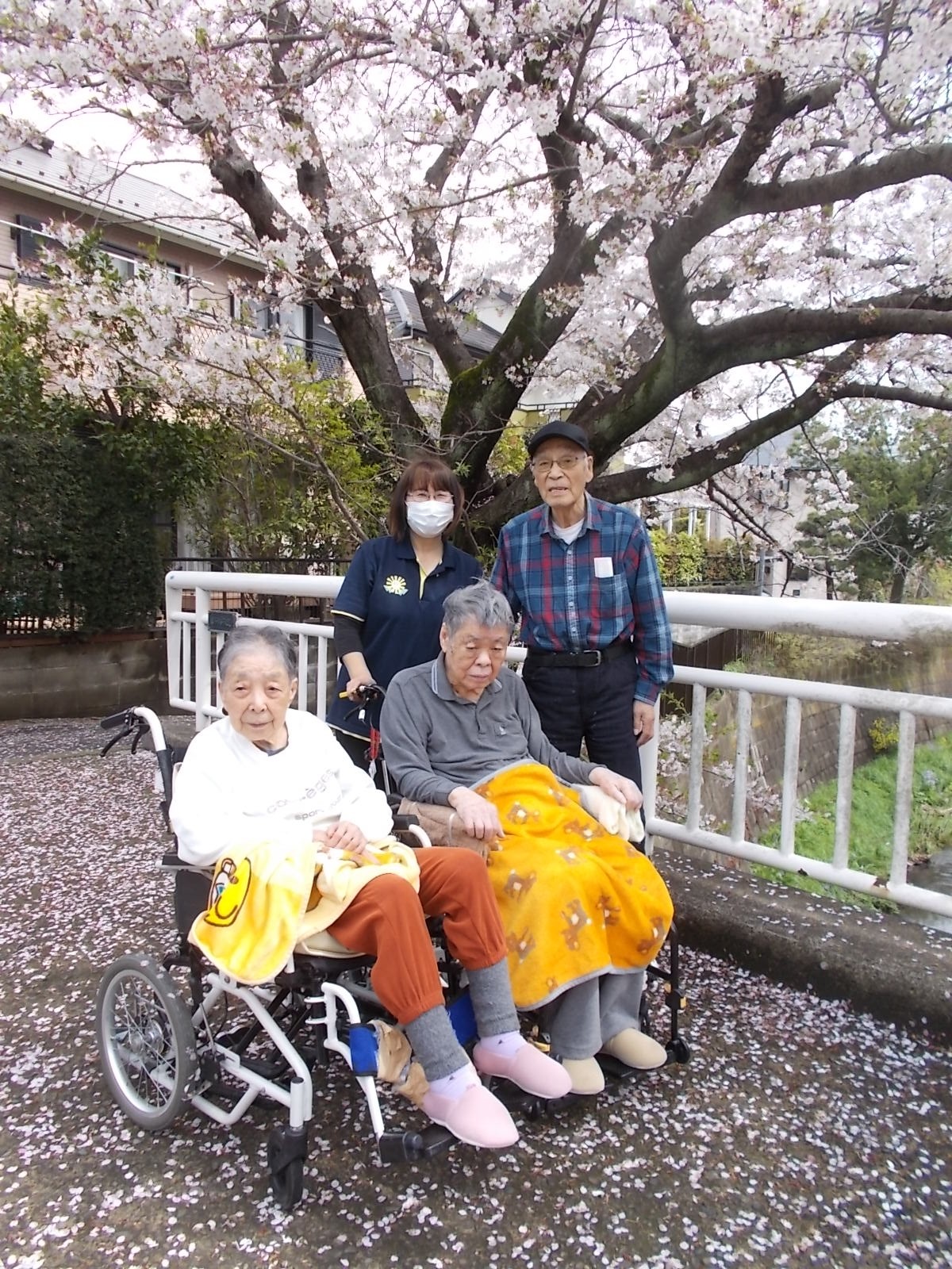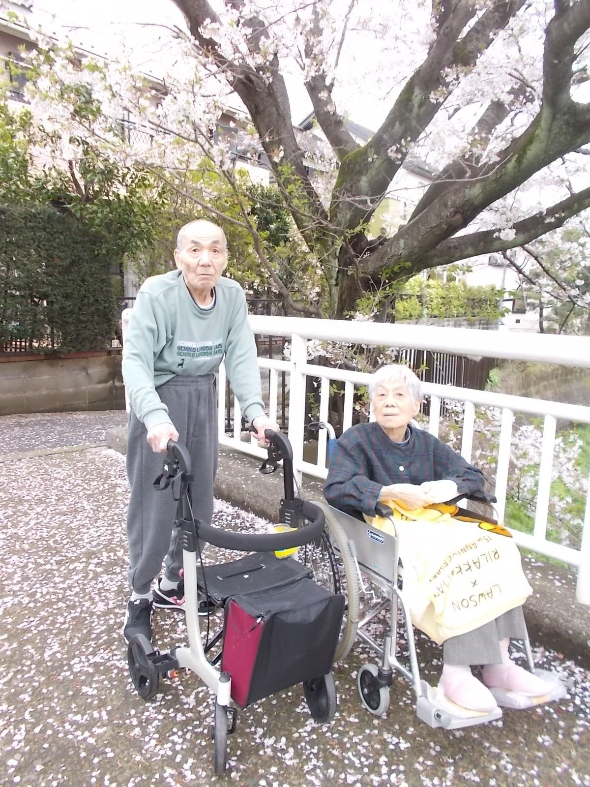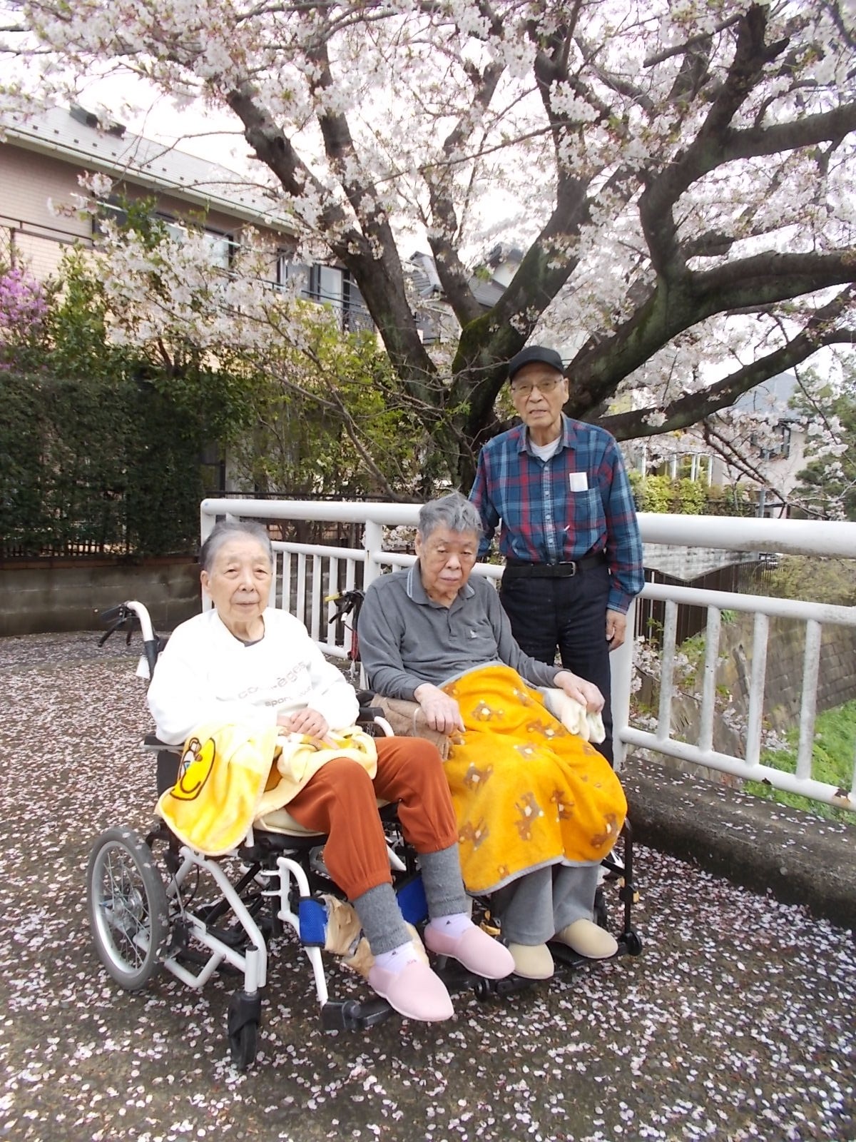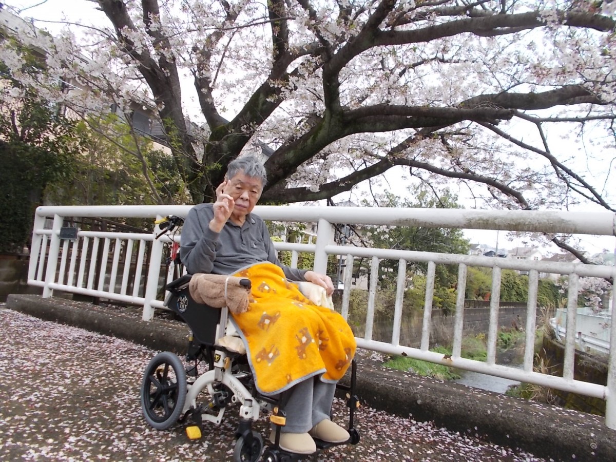 桜のお花を見に、ご利用者様たちを散歩にお連れしました。施設内でサクサク歩いていらっしゃる方も外の歩道は