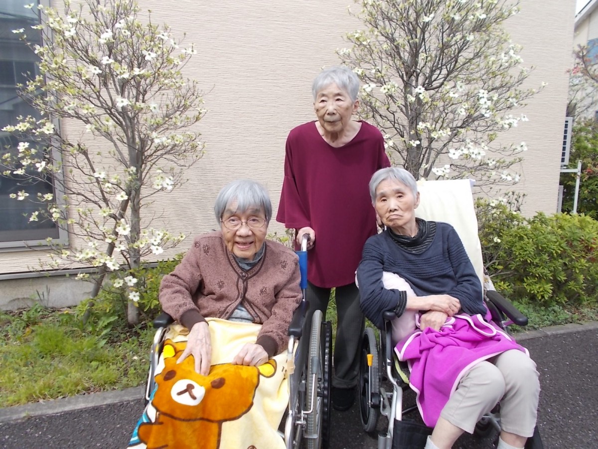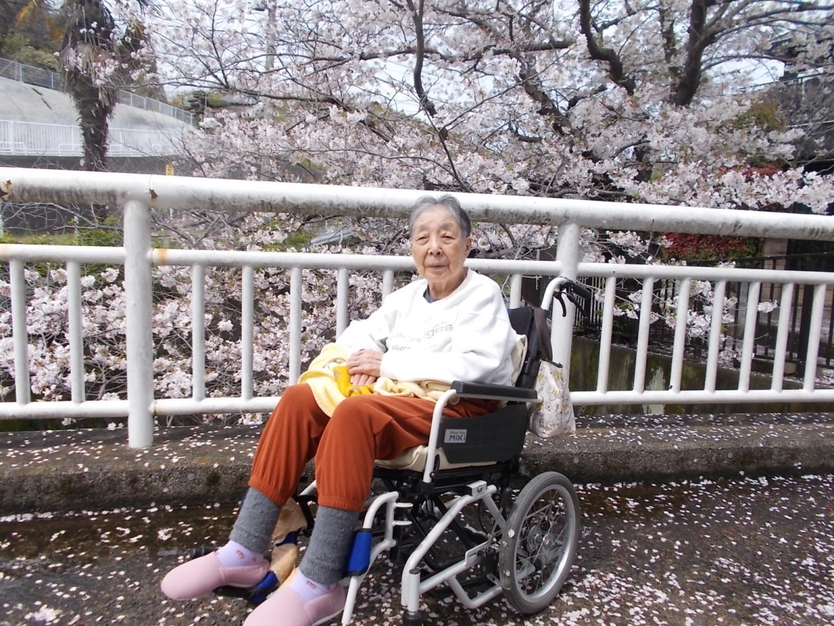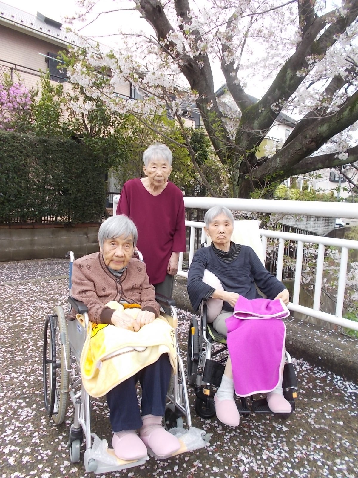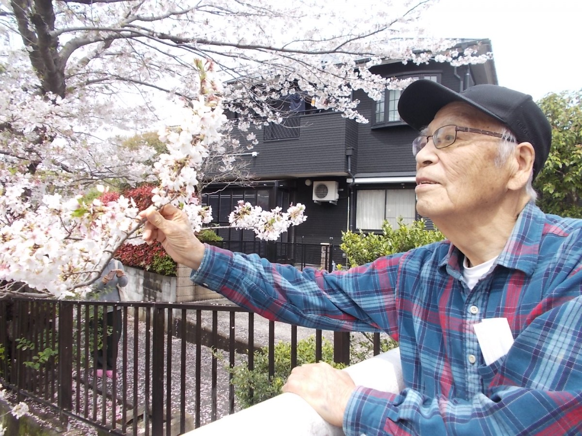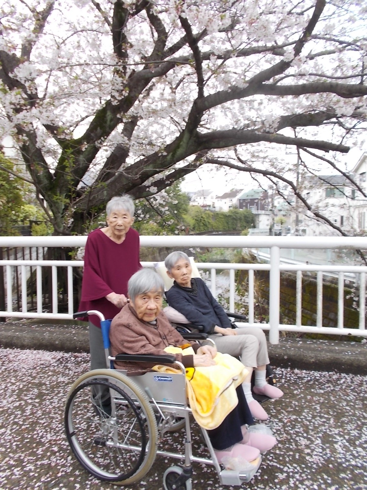 桜のお花を見に、ご利用者様たちを散歩にお連れしました。施設内でサクサク歩いていらっしゃる方も外の歩道は