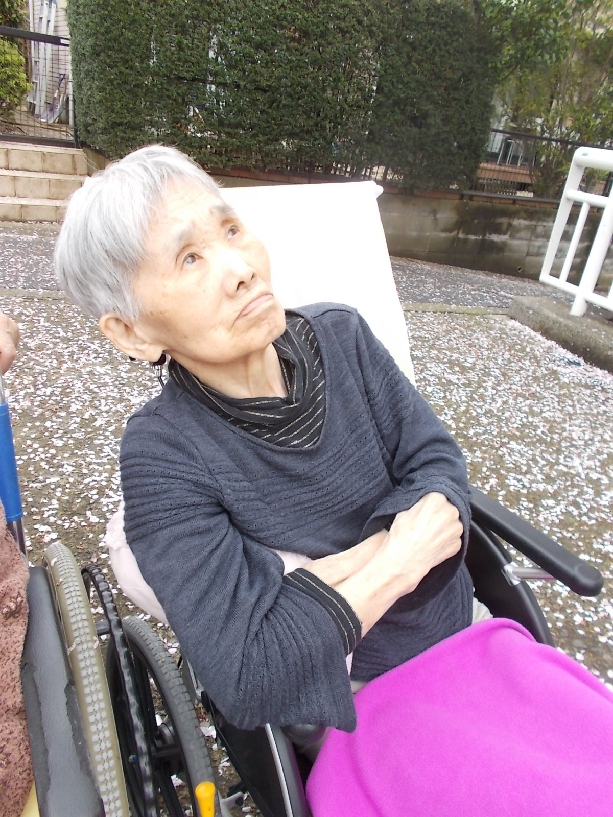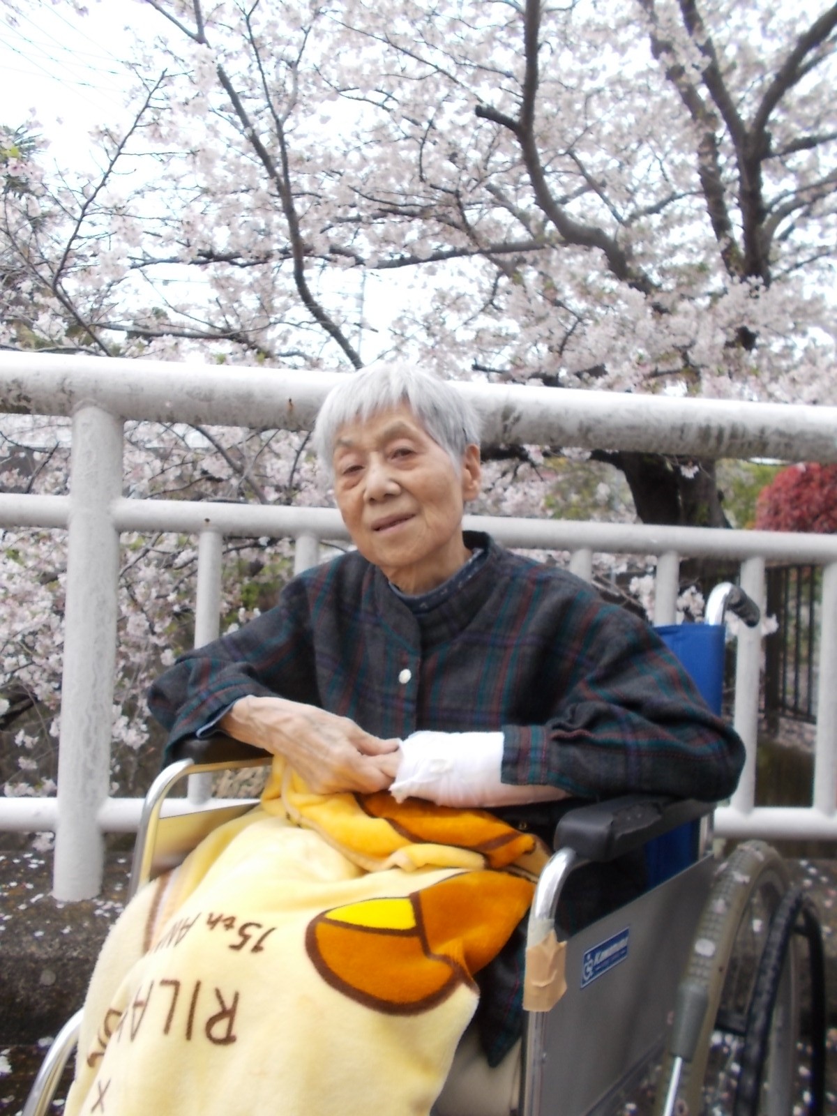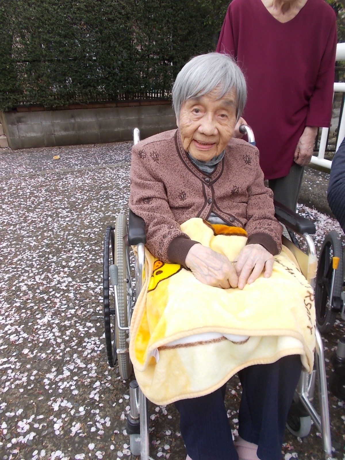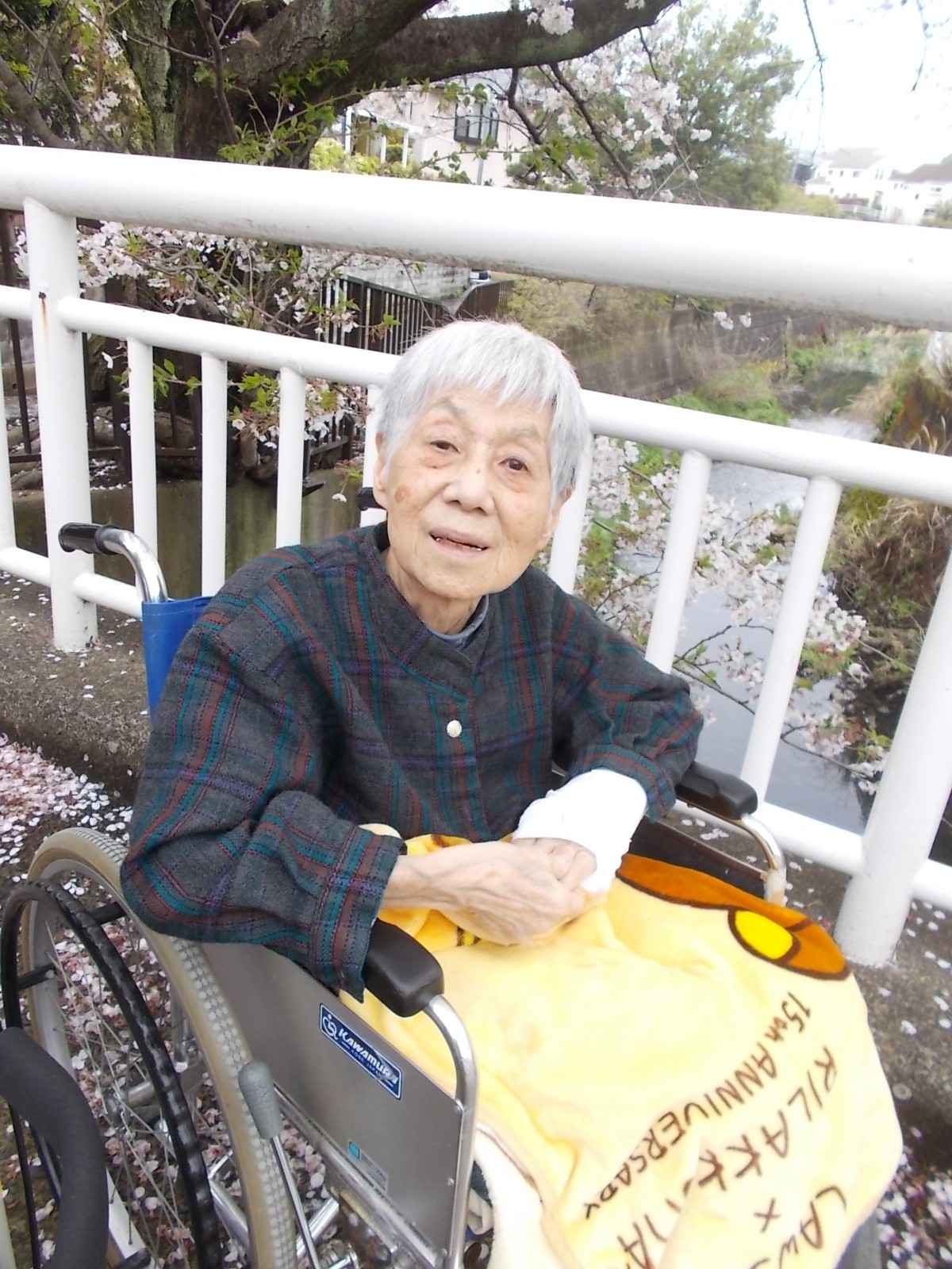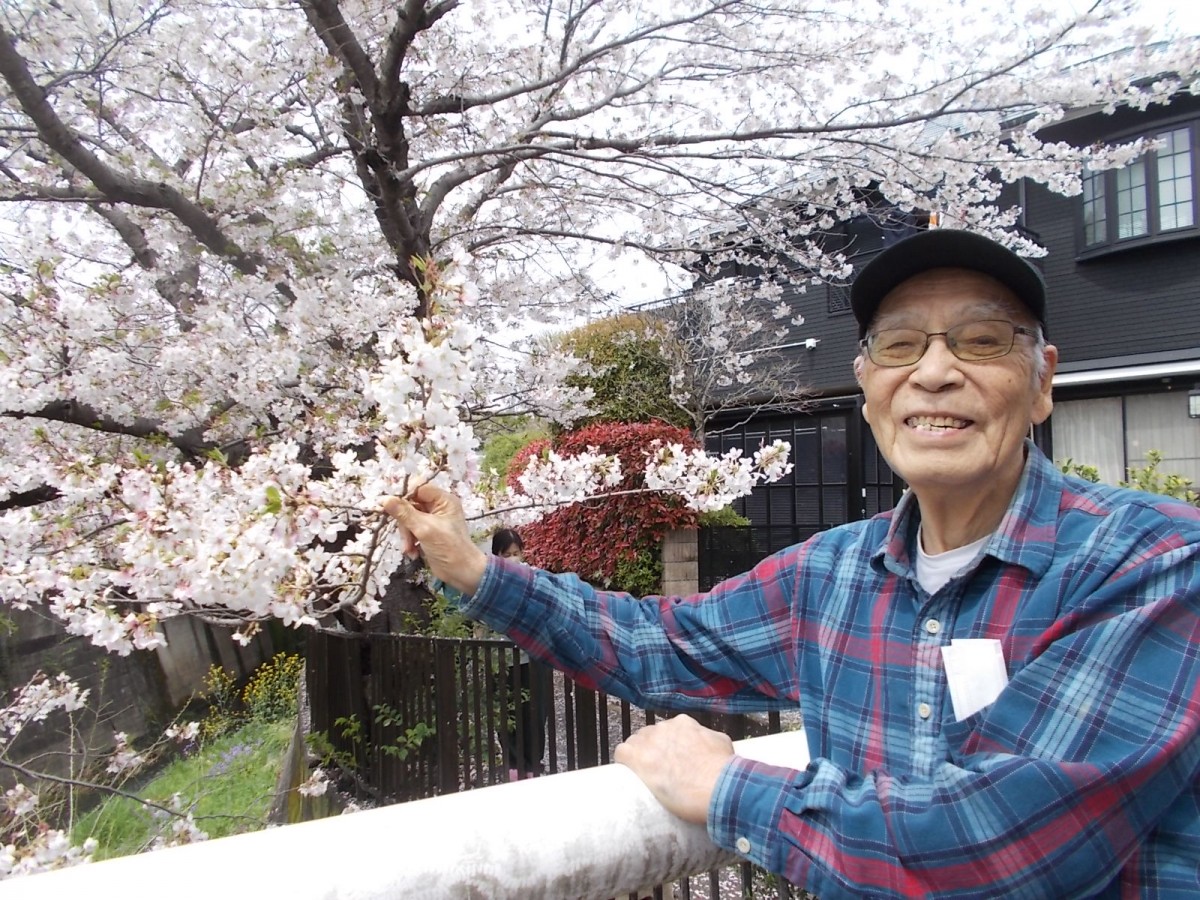 桜のお花を見に、ご利用者様たちを散歩にお連れしました。施設内でサクサク歩いていらっしゃる方も外の歩道は