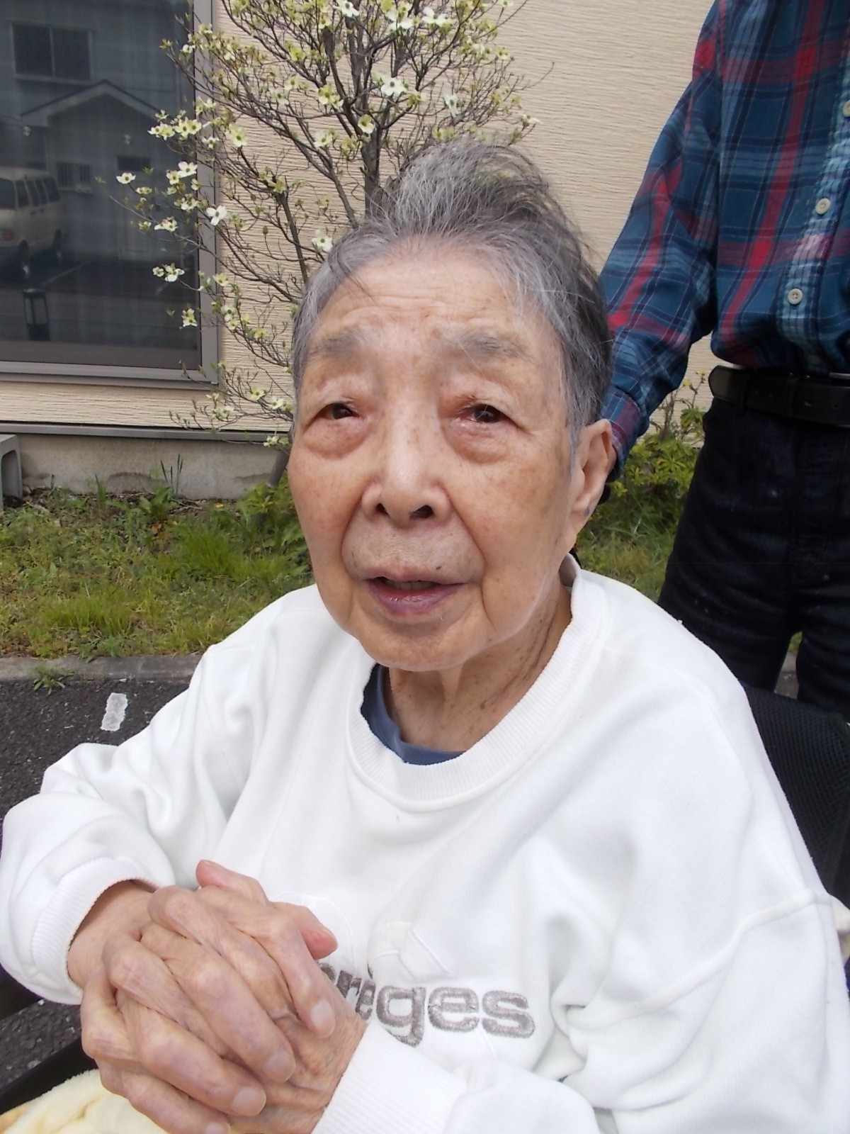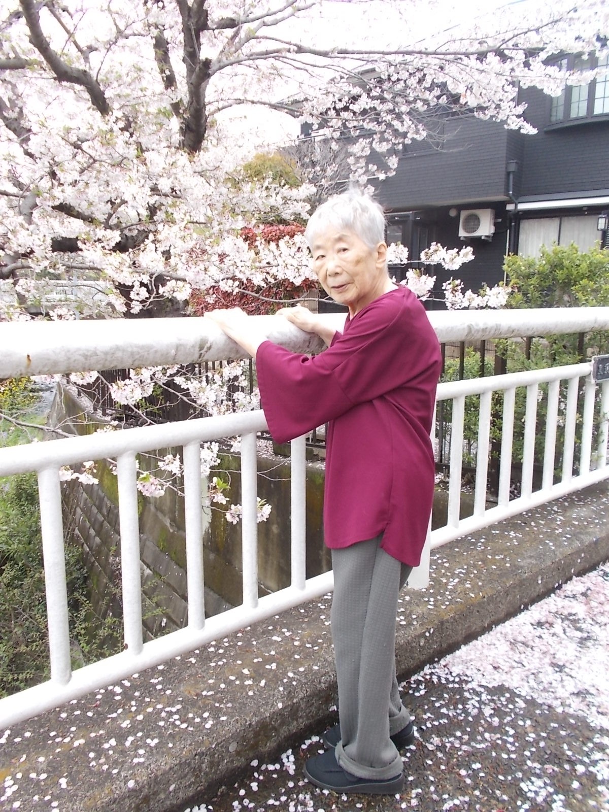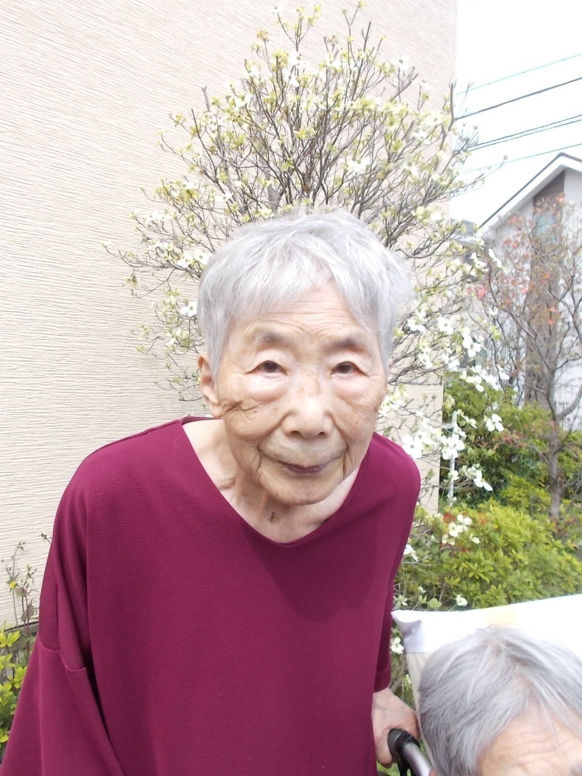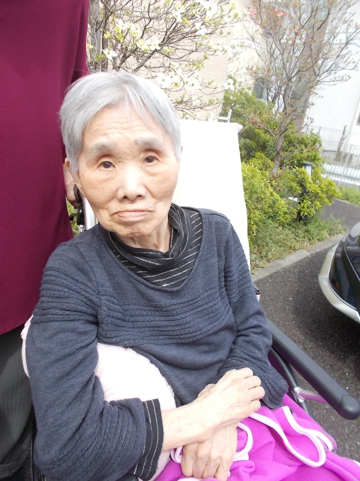 桜のお花を見に、ご利用者様たちを散歩にお連れしました。施設内でサクサク歩いていらっしゃる方も外の歩道は
