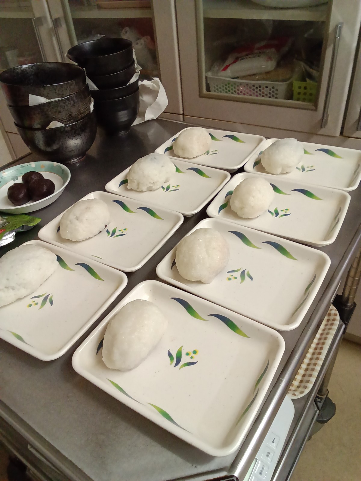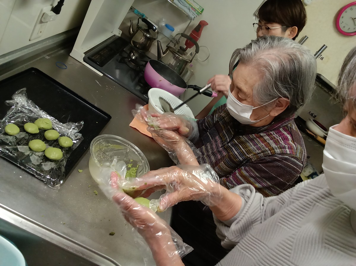 お花見会の後は花より団子という事で、利用者様にも手伝って頂きおはぎと三色団子を作りました。
