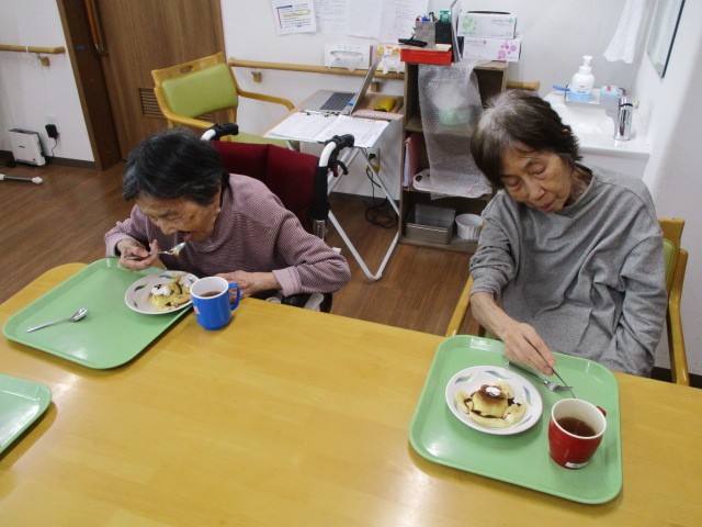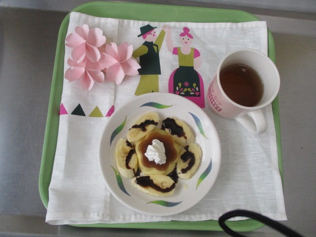 今日は2階でお花見にプリンアラモードを作りました。   召し上がれているご様子をお知らせいたします!!