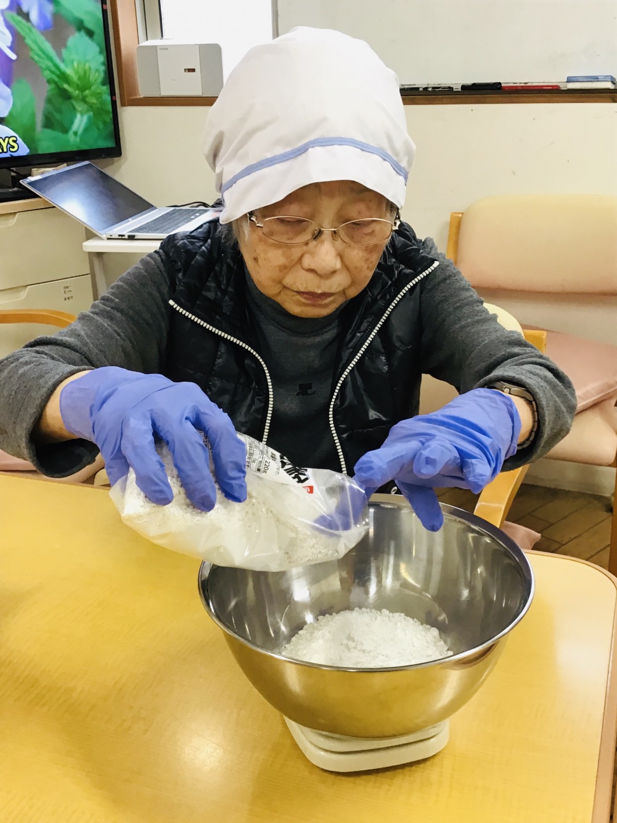 次は、白玉粉とお砂糖を混ぜて、お水を注ぎます。