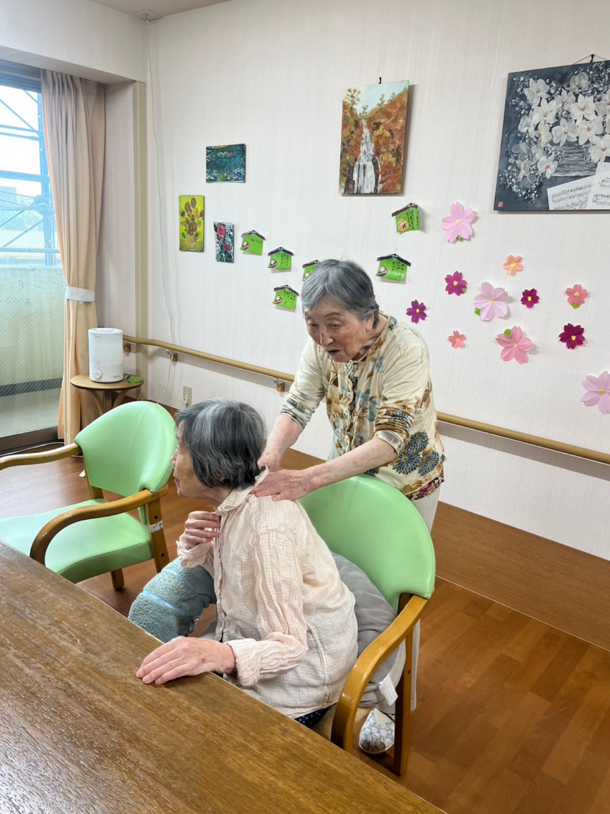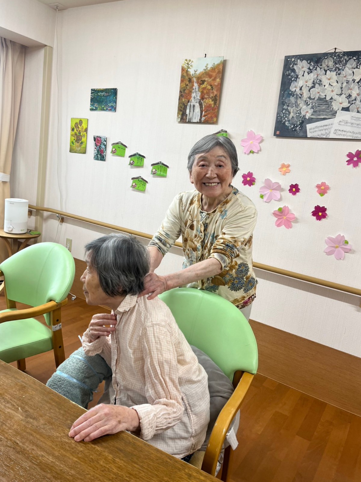 行ってみると‥入居者様同士で肩もみをされる微笑ましい場面が見られました(^^)