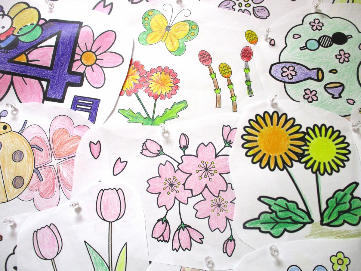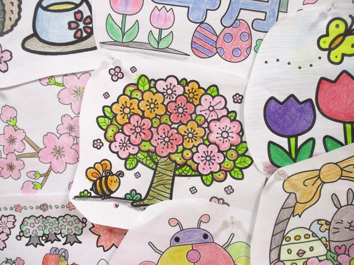 4月は春本番。桜やチューリップ、菜の花など、春を感じさせる華やかなモチーフが並びました。塗り絵では、「ここは薄いピンクがいいね」「葉っぱは濃い色で引き締めようかな」と色選びを楽しまれるご様子が印象的でした。同じ図案でも仕上がりは一つひとつ異なり、それぞれの個性が光る作品ばかりです。