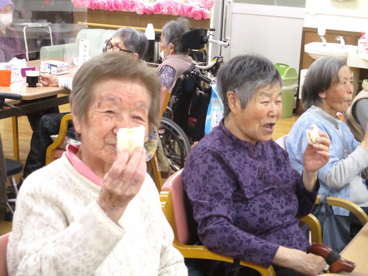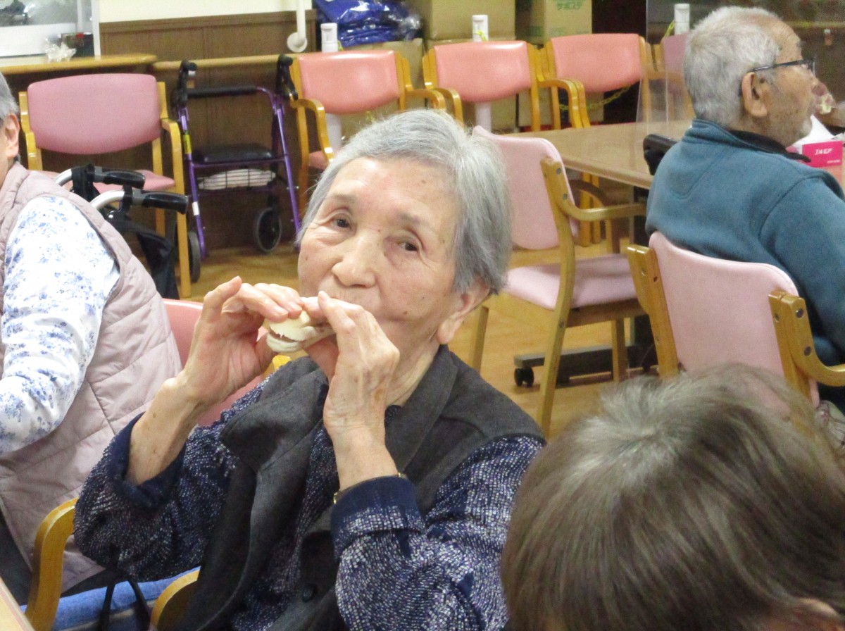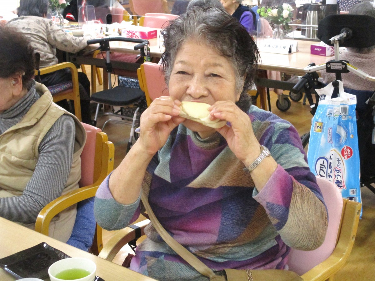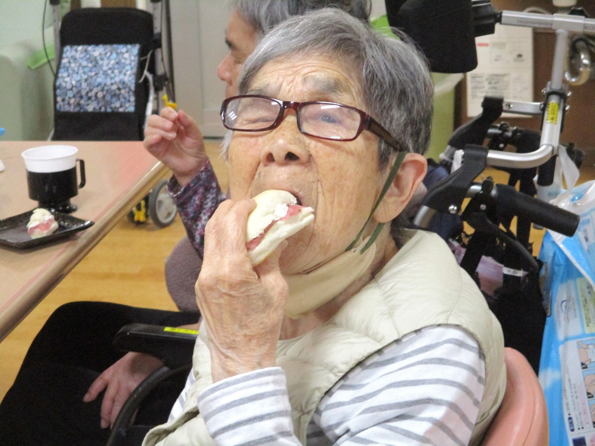 今日はセンター長の手作りおやつということで、「楽しみにしてたの」といったお声も聞かれ、期待の高さがうかがえました。実際に召し上がると、「やっぱり美味しいね」「また食べられてうれしい」とたくさんの笑顔が見られました。パンのやさしい食感と桜あんの上品な甘さ、ホイップクリームのまろやかさが重なり、今回も大満足のおやつタイムとなりました。