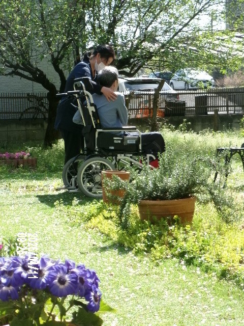 中庭にて看護師とリハビリ中の、S様がいらっしゃいました。