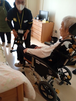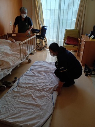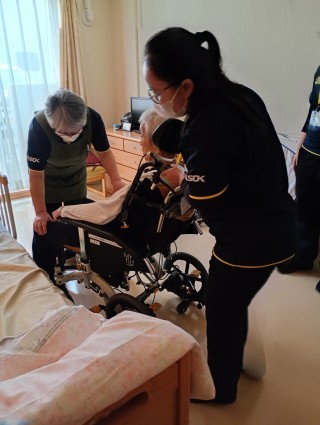 先輩スタッフの指導を受け、ベッドへの移乗介助中です!!