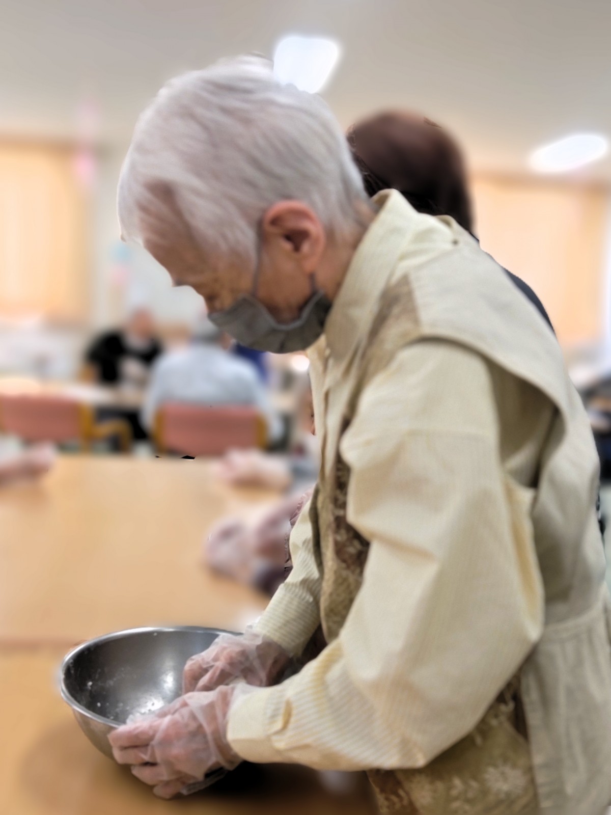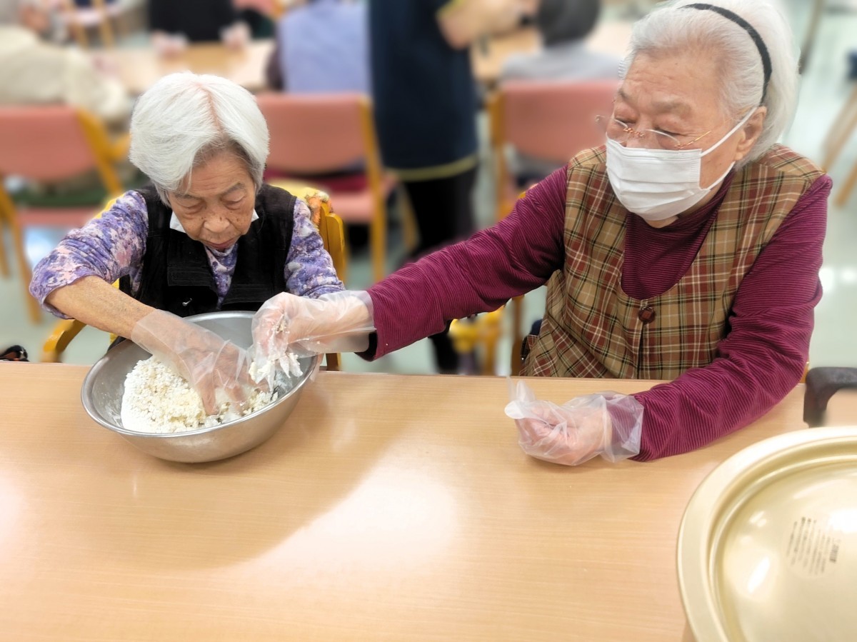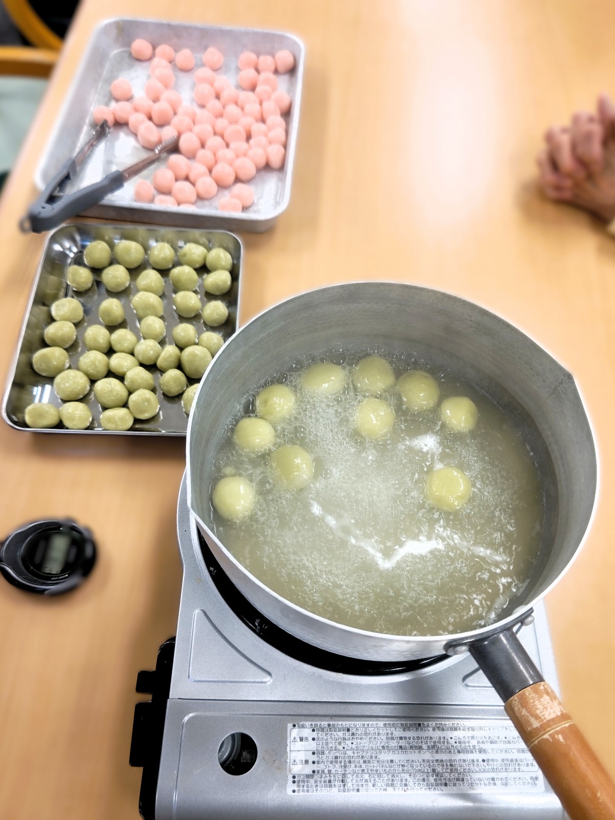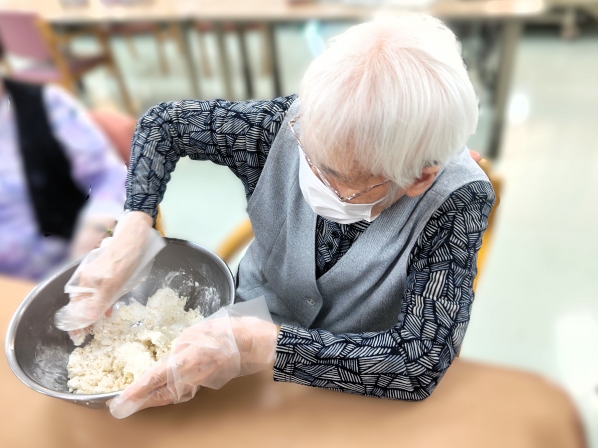 まずは3チームに分かれてそれぞれボウルに白玉粉、上新粉、お豆腐、お砂糖をいれよくこねていただきました!