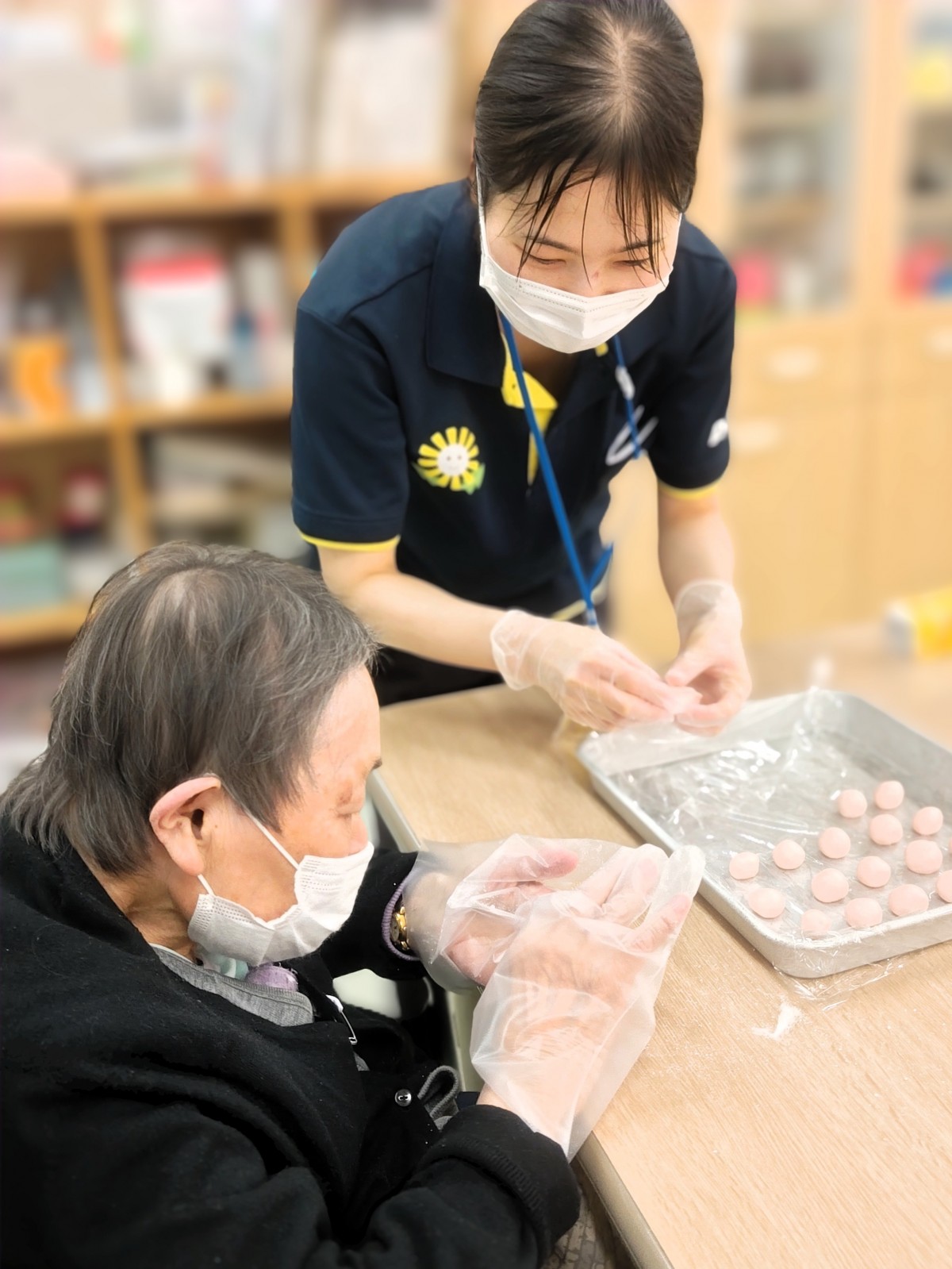 白のお団子には事前に職員が作って置いたみたらし餡を中心部にいれてみたらし味に!