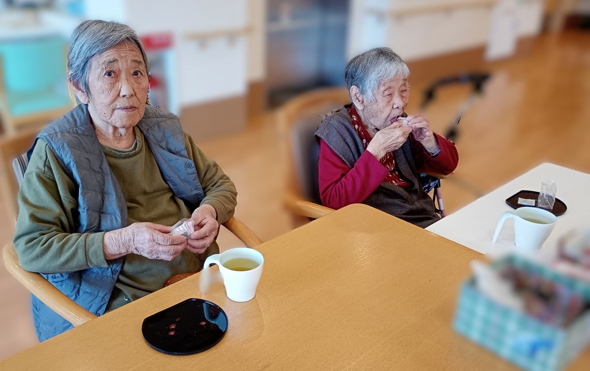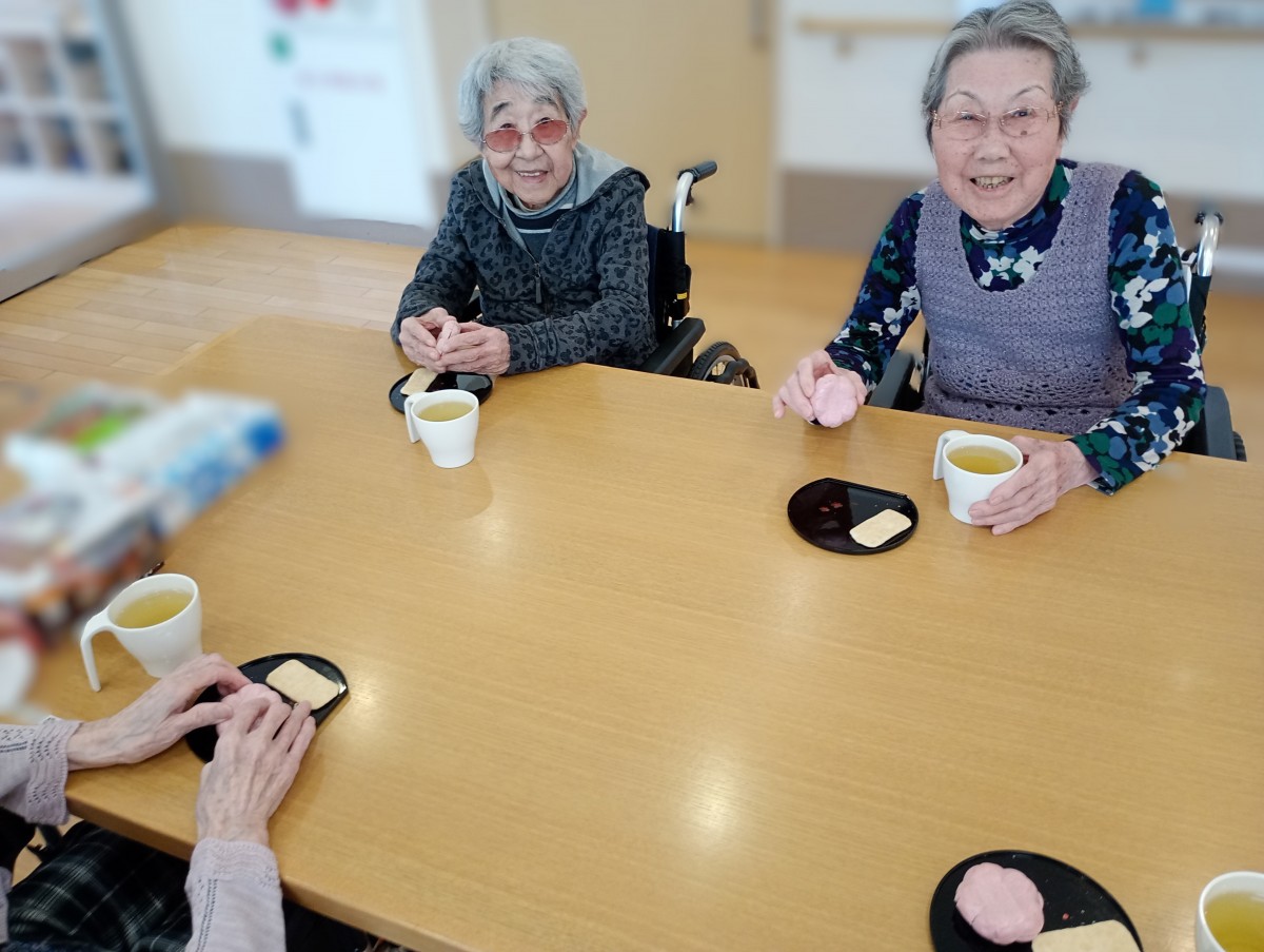 本日、4月11日におやつレクとして、サクラの大福と最中をご用意しました。