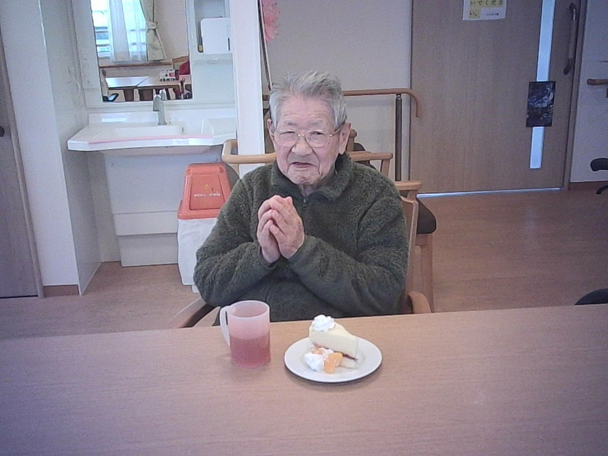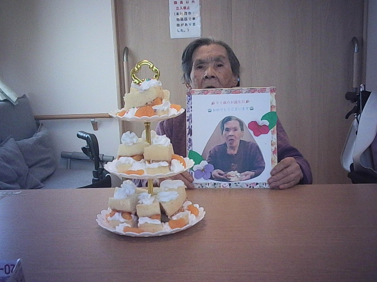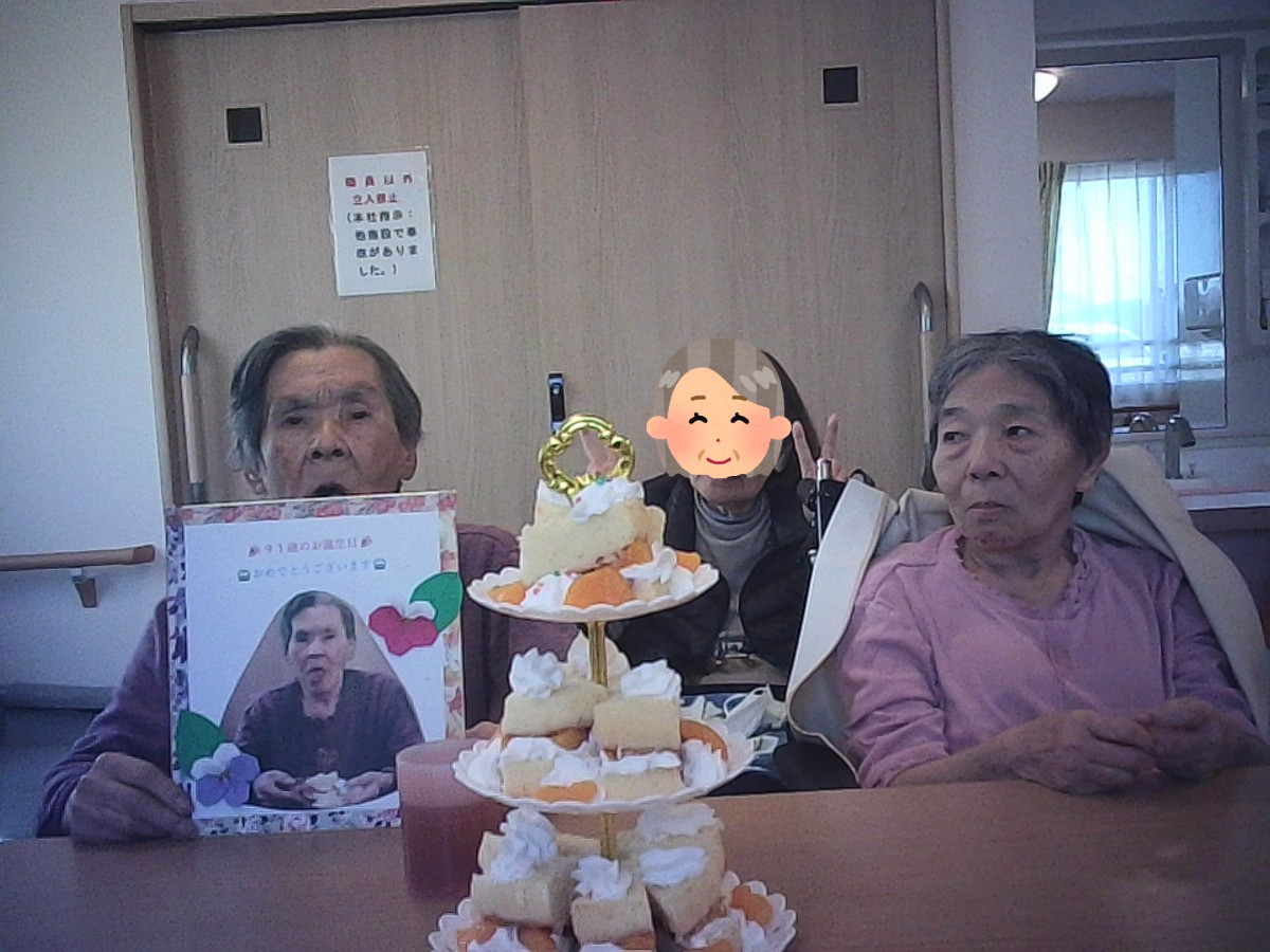 職員、入居者様の皆様からお祝いされとても嬉しそうにしておりました