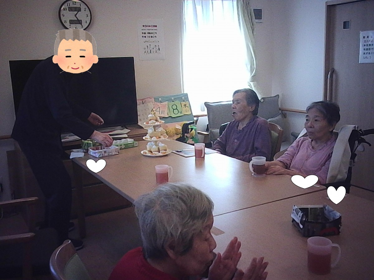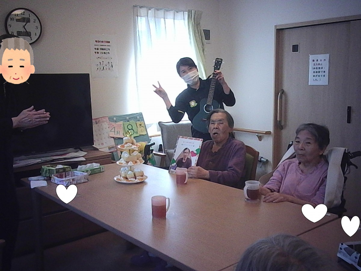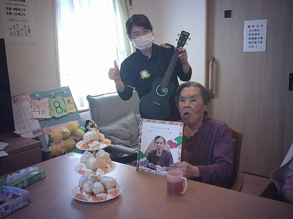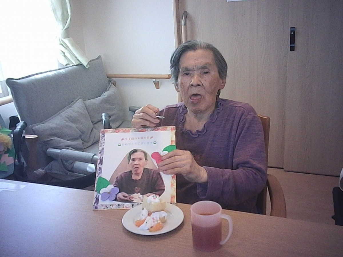 職員、入居者様の皆様からお祝いされとても嬉しそうにしておりました
